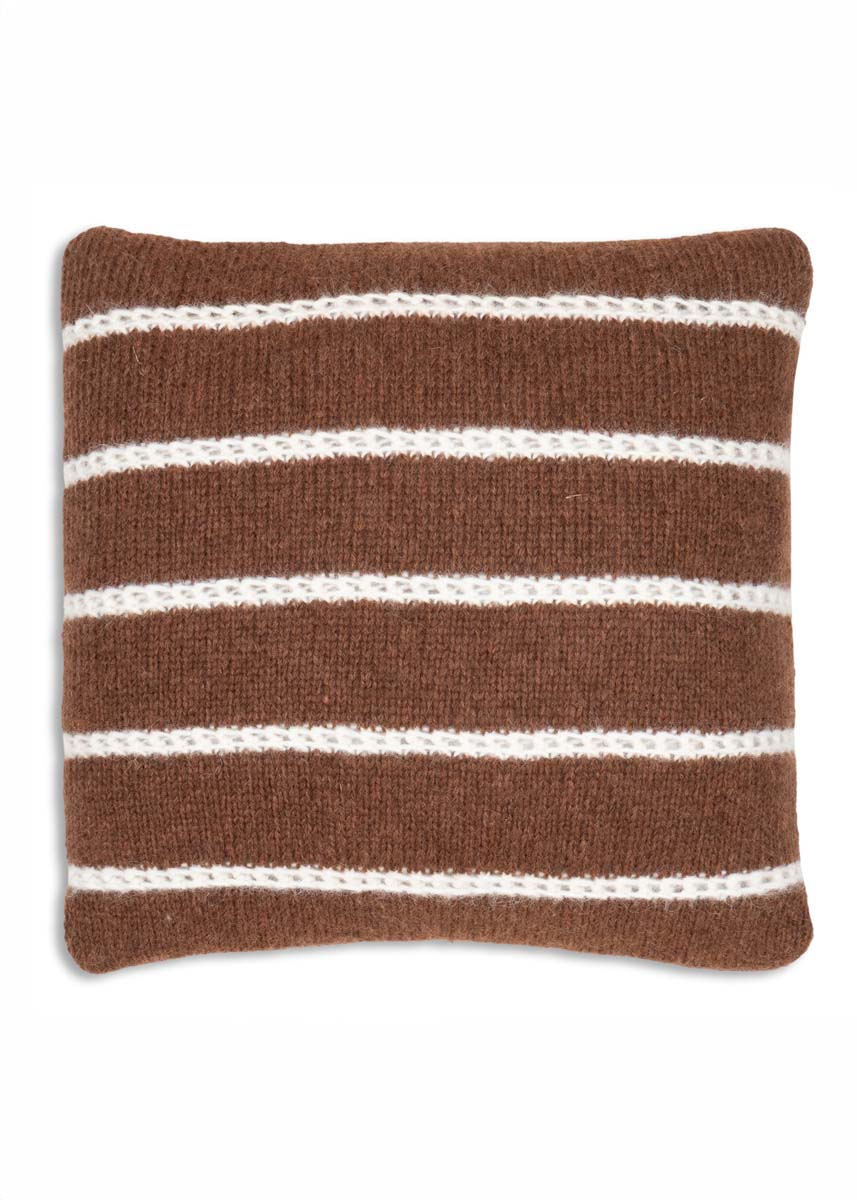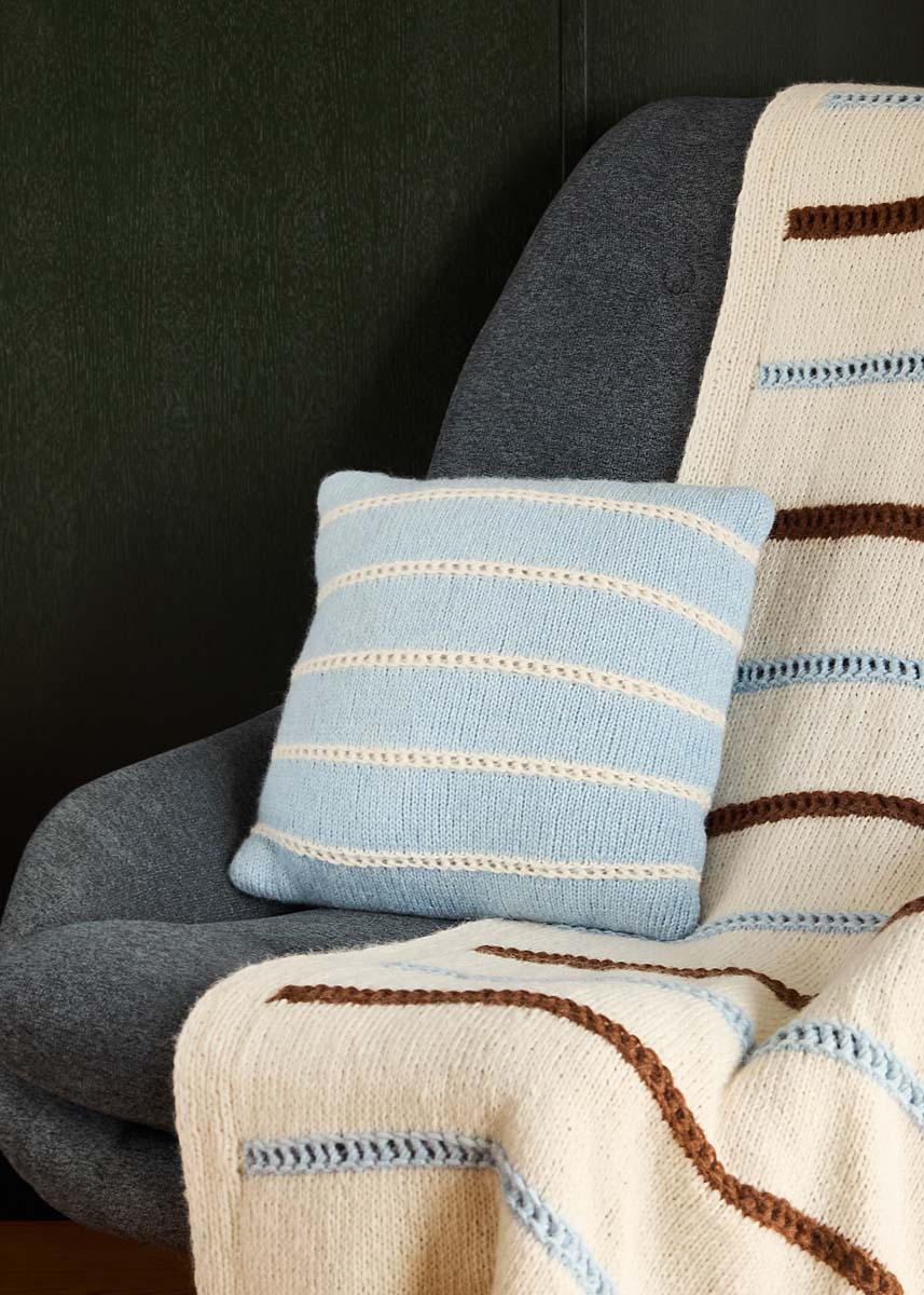 Lana Grossa-kvalitet „Brigitte No. 2” (47 % (baby) alpacka, 45 % bomull, 8 % ren ny ull (merino), löplängd = ca. 140 m/50 g): ca. 200 g var i chokladbrun (färg. 68) eller lysandeblå (färg. 65) och ca. 50 g var i råvit (färg. 16); stickor nr. 4; 2 tvättbara kuddar/ kuddfyllningar, 40 ggr 40 cm.
