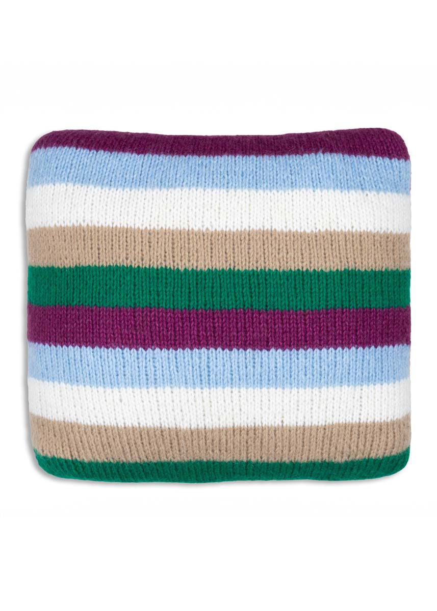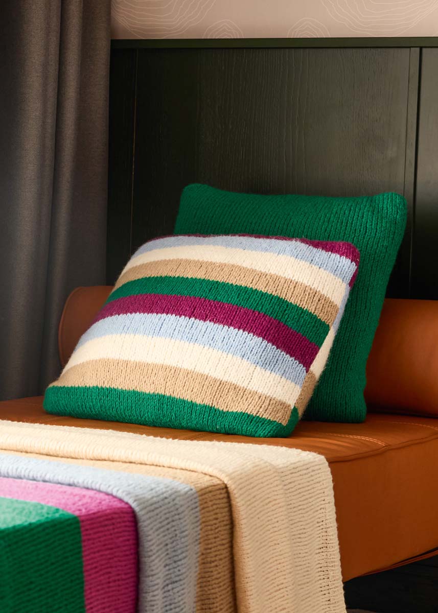 Lana Grossa-kvalitet „Ecopuno Chunky” (50 % ren ny ull (merino), 50 % polyamid, löplängd = ca. 100 m/50 g): je ca. 100 g smaragd (färg. 139), sandbeige (färg. 141), råvit (färg. 111), pastellblå (färg. 142) och rödviolett (färg. 128); stickor nr. 7; 1 tvättbar kudde/kuddfyllning, 45 x 45 cm.