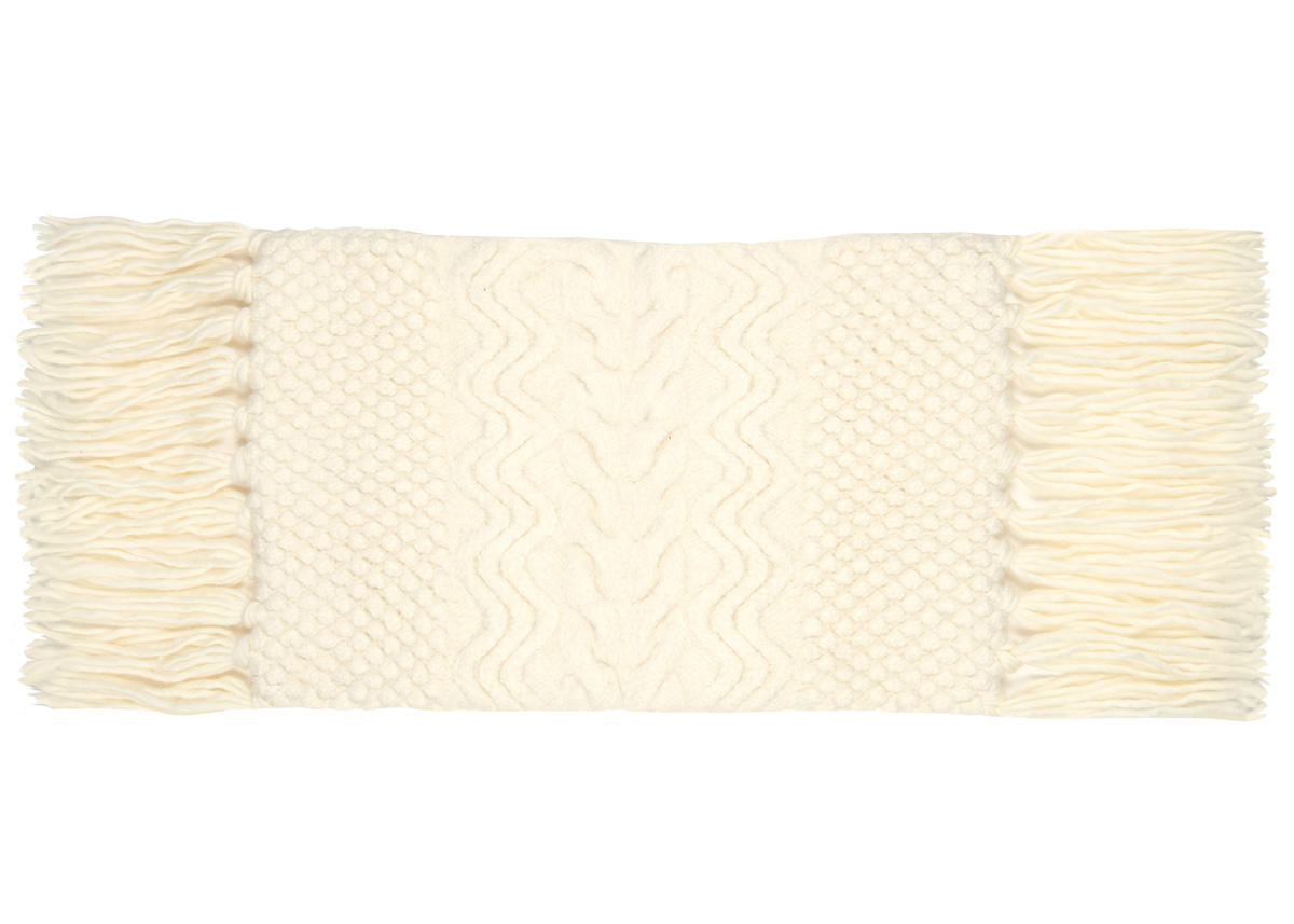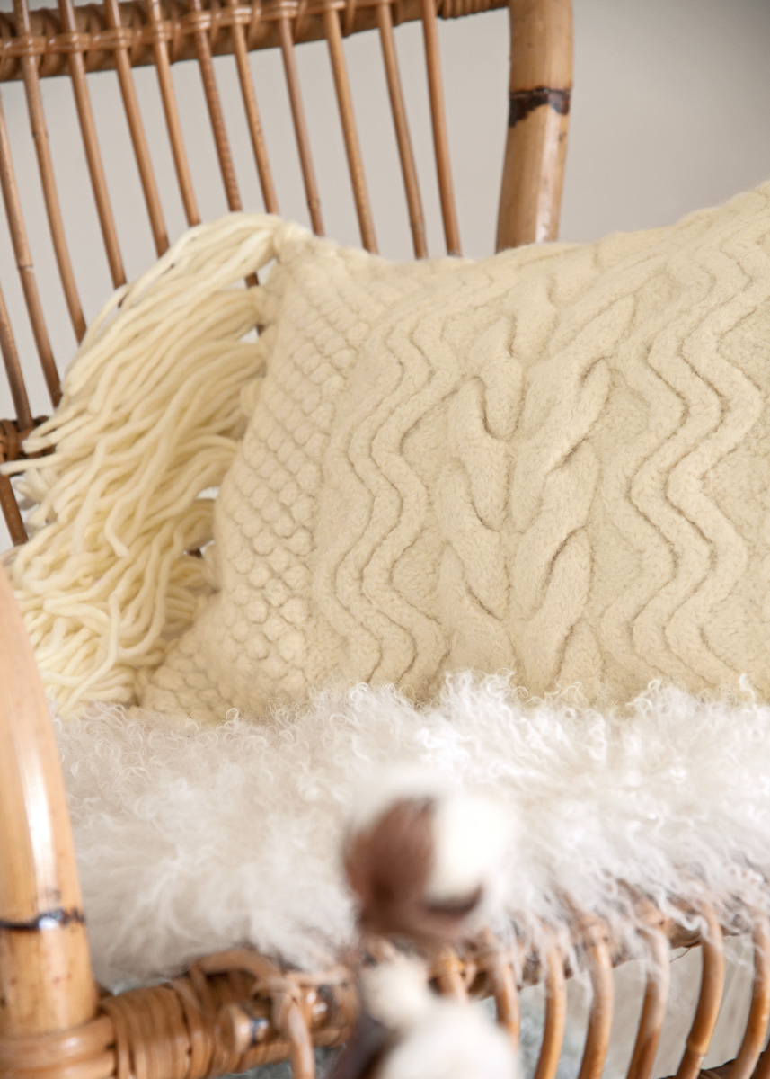 Material: Lana Grossa Feltro (100% ren ny ull, løpelengde 50 m/50 g), 850 g råhvit (farge 1); 1 strikkepinner nr. 8, 1 heklenål nr. 6, putefylling 60 x 40 cm.