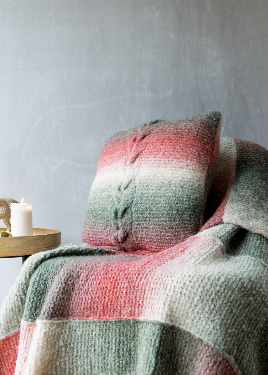 Lana Grossa-kvalitet Christmas Edition Gigante Lurex (70% alpakka (fin), 30% polyamid, løpelengde = ca 150 m/50 g): 150 g rød/grønn/hvit (farge 999); strikkepinner nr. 6; 1 flettepinne; 1 vaskbar putefyll 50 x 50 cm.
