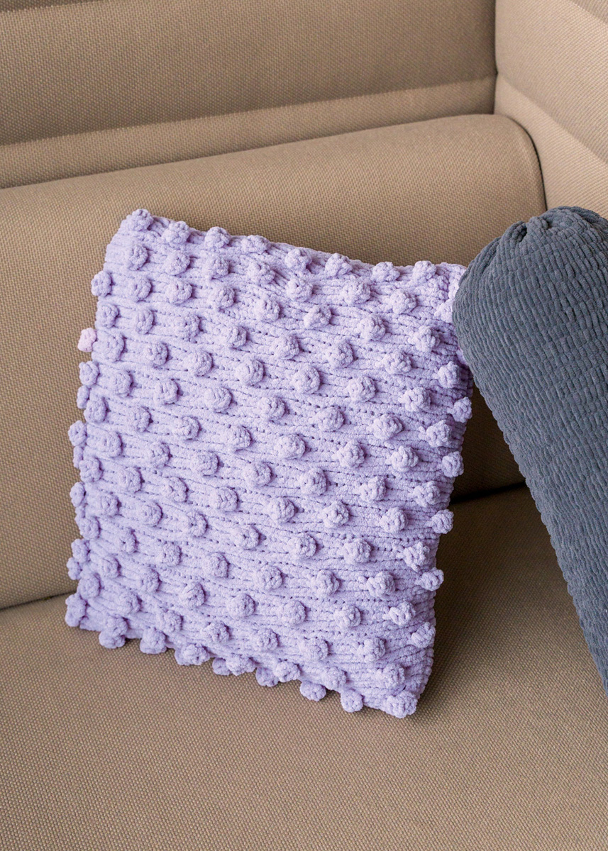 Lana Grossa ”The Look” (100 % polyester, løbelængde 120 m / 100 gr), 200 gr lilla (fv 9), strikkepinde nr. 6, fyldpude på 40 x 40 cm.