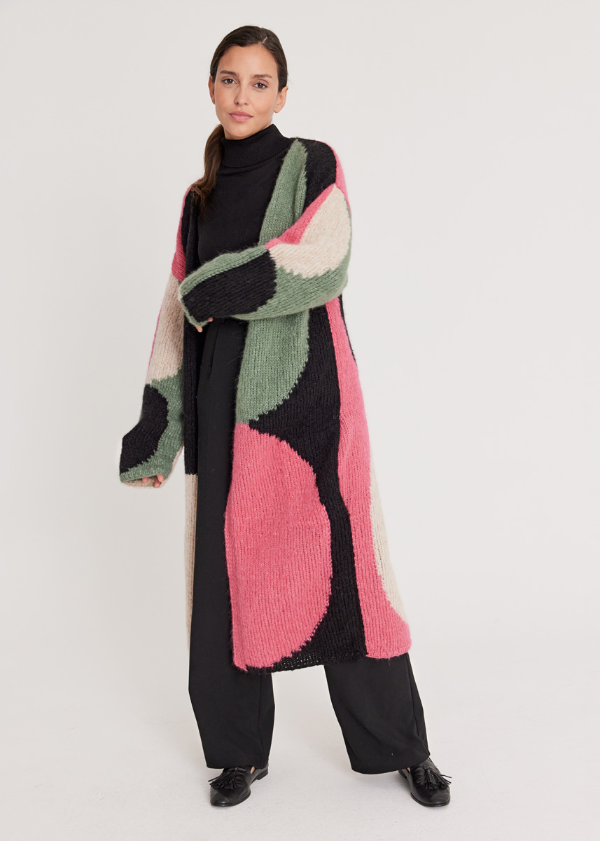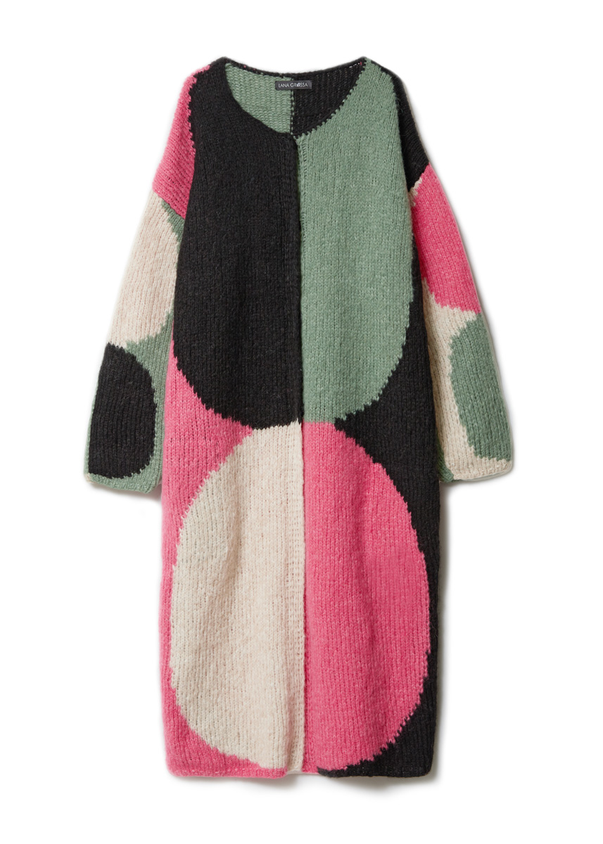 Lana Grossa „Alpaca Air“ (62% alpacka (baby), 27% polyamid, 11 % ren ny ull (merino extrafine), löplängd 140 m/50 g), 200 (200 – 250) g beige (färg 2), 200 (200 – 250) g svart (färg 12), 150 (200 – 200) g pink (färg 7), 150 (150 – 200) g grågrön (färg 14); stickor nr. 6, 1 virknål nr. 5 och 4 svarta tryckknappar från Union Knopf, Ø 20 mm.