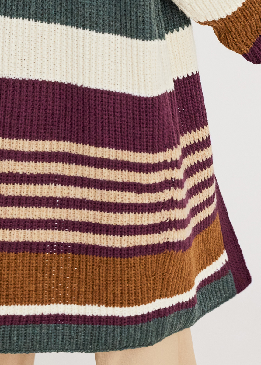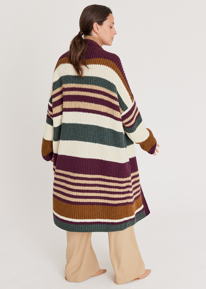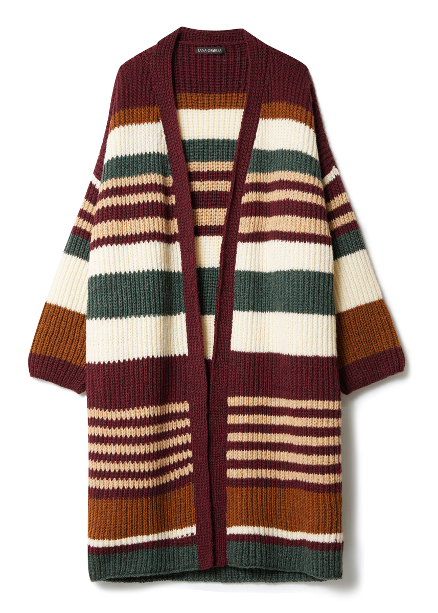 Lana Grossa „Cool Merino“ (90% ren ny ull (merino), 10% polyamid, löplängd 150 m/50 g), 350 (400 – 450) g brunröd (färg 28), 250 (300 – 300) g vit (färg 15), 150 g ljus beige (färg 23), 150 g mörk röd (färg 19) och 150 g nougat (färg 9); stickor nr. 4,5 och 5.