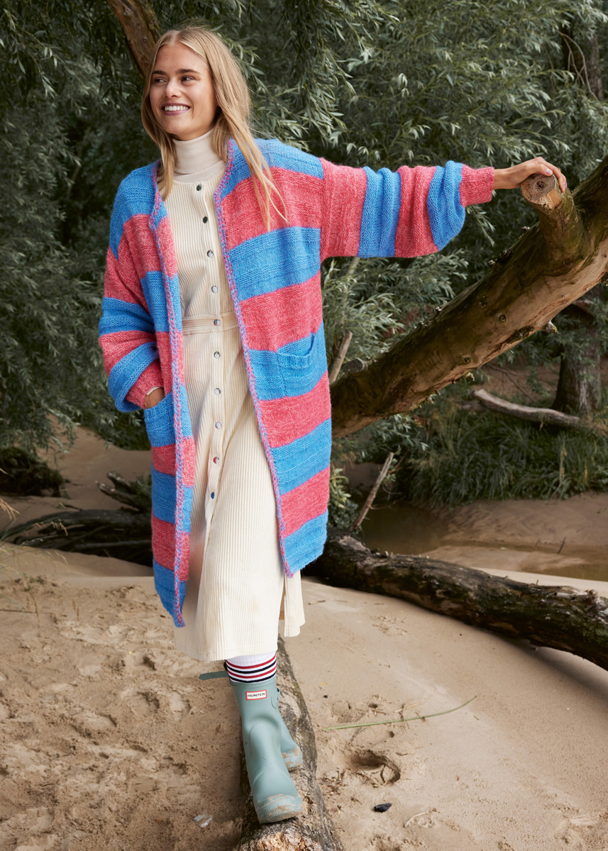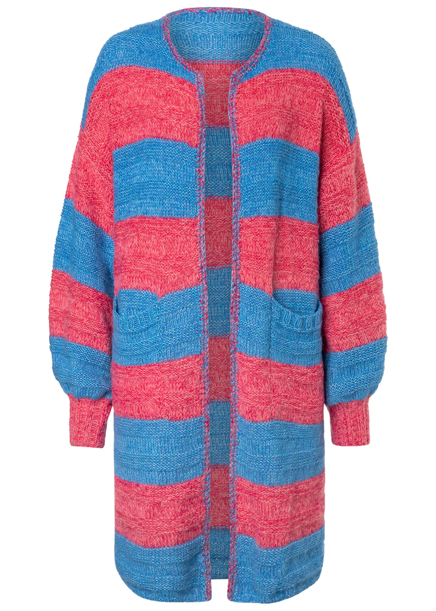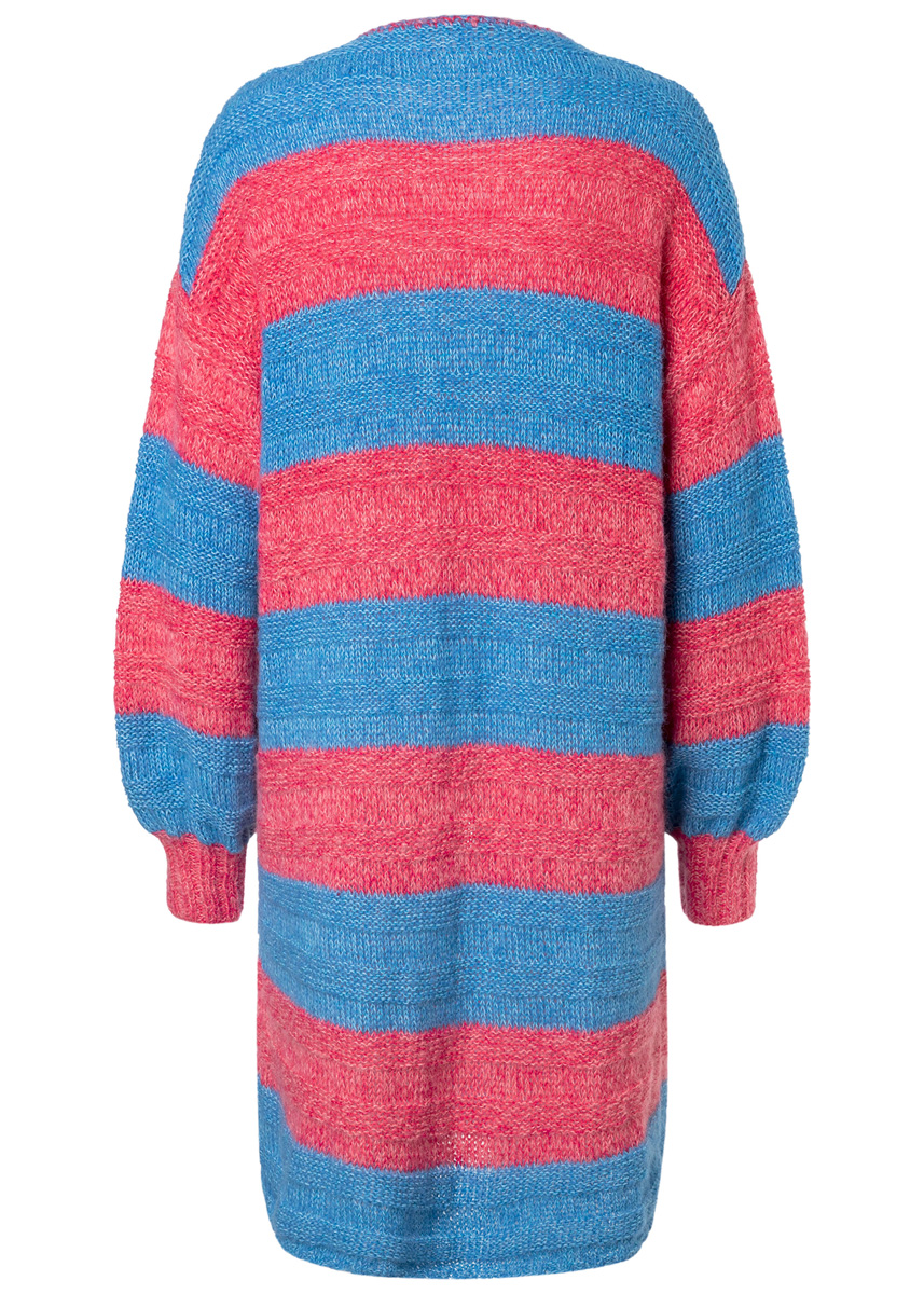 Lana Grossa „Ecopuno“ (72% bomull, 17% ren ny ull (merino), 11% alpacka (baby), löplängd 215 m/50 g), 200 (250 – 300) g turkosblå (färg 29) och 200 (250 – 300) g hallon (färg 36) och Lana Grossa „Setasuri“ (69% alpacka (Suri), 31% silke, löplängd 212 m/25 g), 100 (125 – 150) g blå (färg 15) och 100 (125 – 150) g bonbonrosa (färg 32); stickor nr. 4 och 5,5, 1 virknål nr. 4,5. OBS: Modellen stickas med dubbla trådar i följande garn- och färg-sammansättningar: Färg A: Ecopuno turkosblå + Setasuri blå. Färg B: Ecopuno hallon + Setasuri bonbonrosa.
