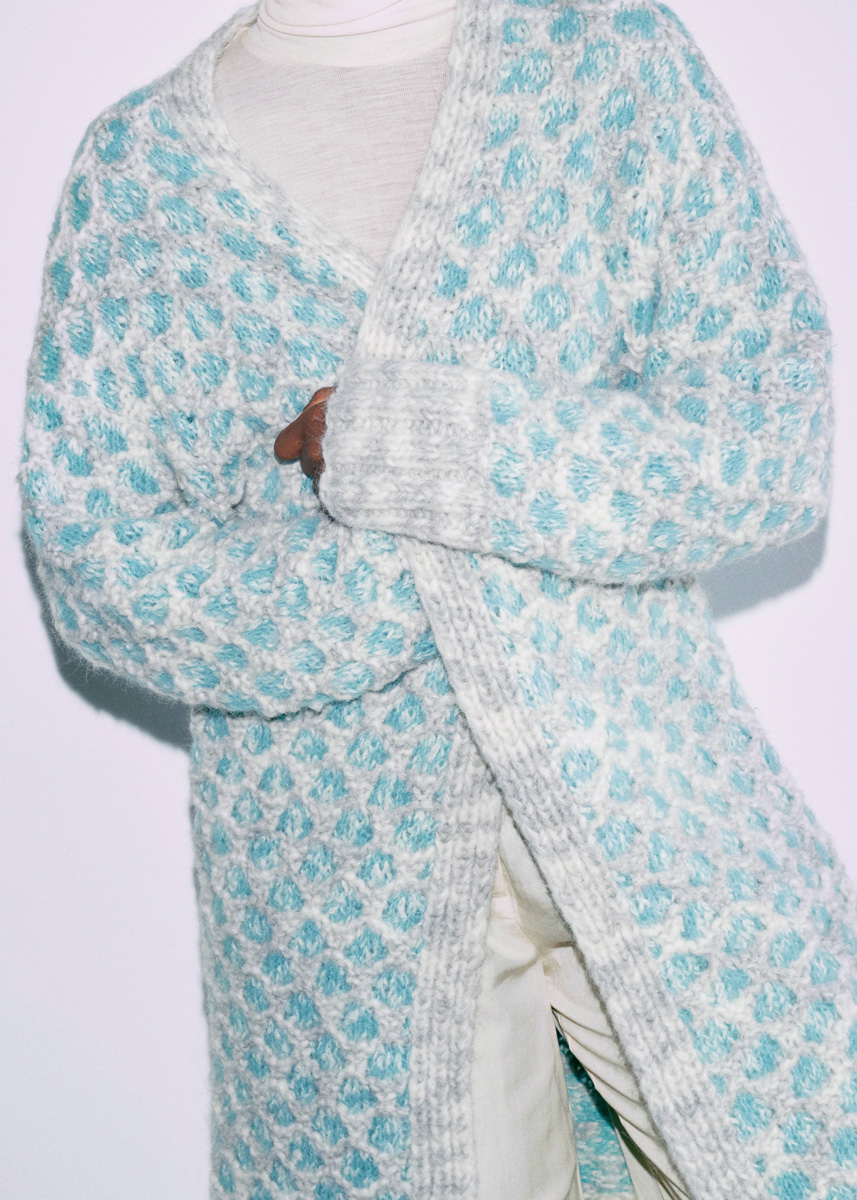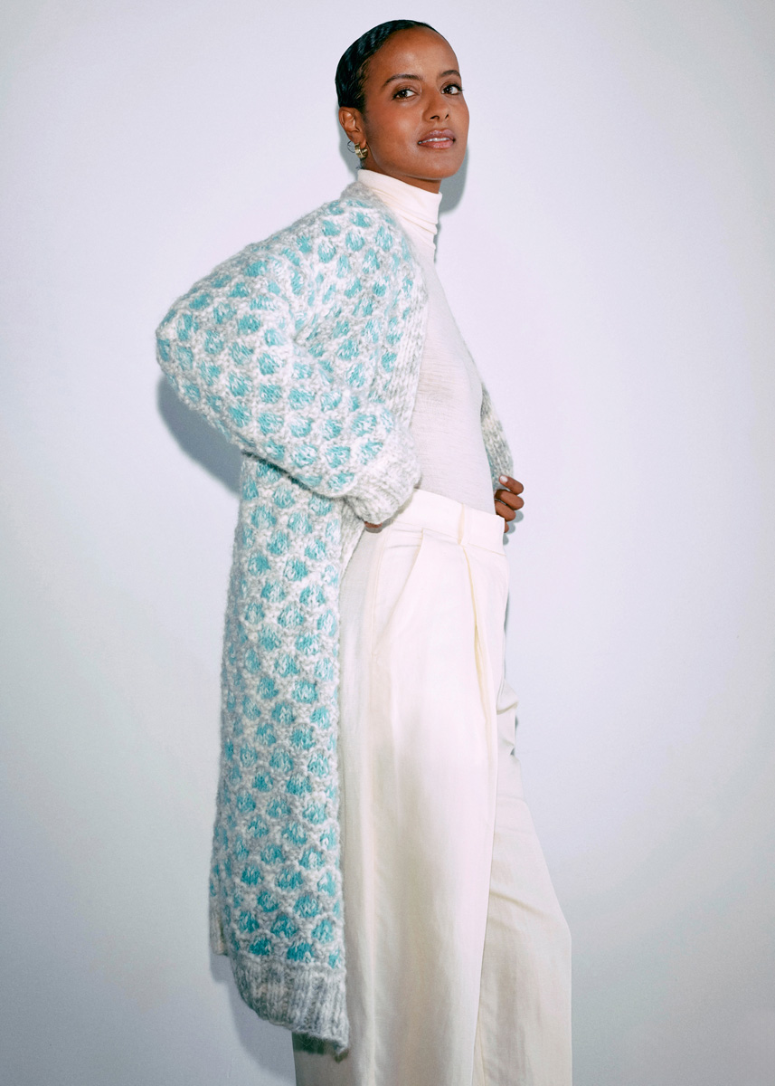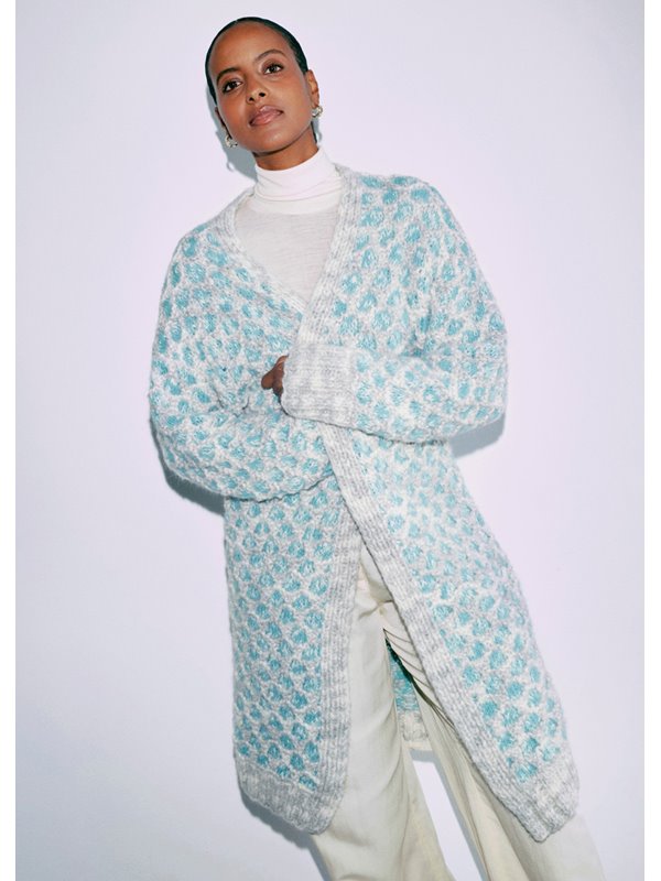 Lana Grossa-kvalitet „Lala Berlin Smoothy“ (62 % alpacka (baby), 27 % polyamid, 11 % ren ny ull (merino fin), löplängd = ca. 135 m/50 g): ca. 500 (600) g råvit/Hellgrå (färg 9); Lana Grossa-kvalitet „Lala Berlin Buffy“ (47 % alpacka (baby), 30 % bomull, 23 % polyamid, löplängd = ca. 225 m/50 g): ca. 300 (400) g mintturkos/råvit (färg 5); stickor nr. 7. Tips: Den långa cardiganen stickas med dubbla trådar, 2 trådar i samma gran-kvalitet.
