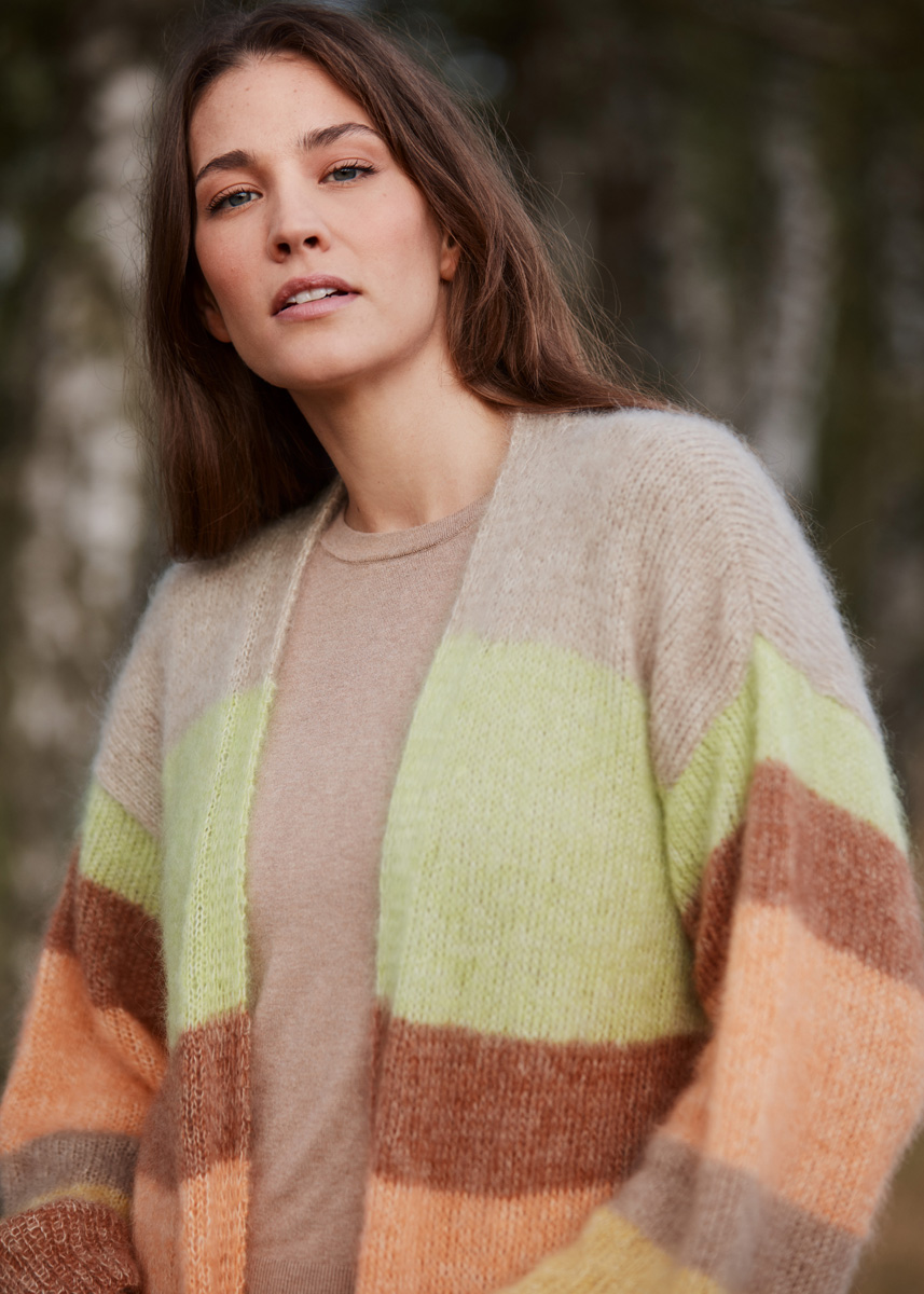 Lana Grossa-kvalitet „Silkhair“ (70 % mohair (superkid), 30 % silke, löplängd = ca 210 m/25 g): ca 150 (150 - 175 - 175) g råvit (färg 52), ca 50 (50 - 75 - 75) g signalgrön (färg 157), ca 25 (25 - 50 - 50) g curry (färg 160), ca 75 (75 - 100 - 100) g pärlbeige (färg 123), ca 50 (50 - 75 - 75) g pumpa (färg 190) och ca 75 (75 - 100 - 100) g rost (färg 181); stickor nr 3,5 och nr 4. Cardiganen stickas med dubbla trådar.