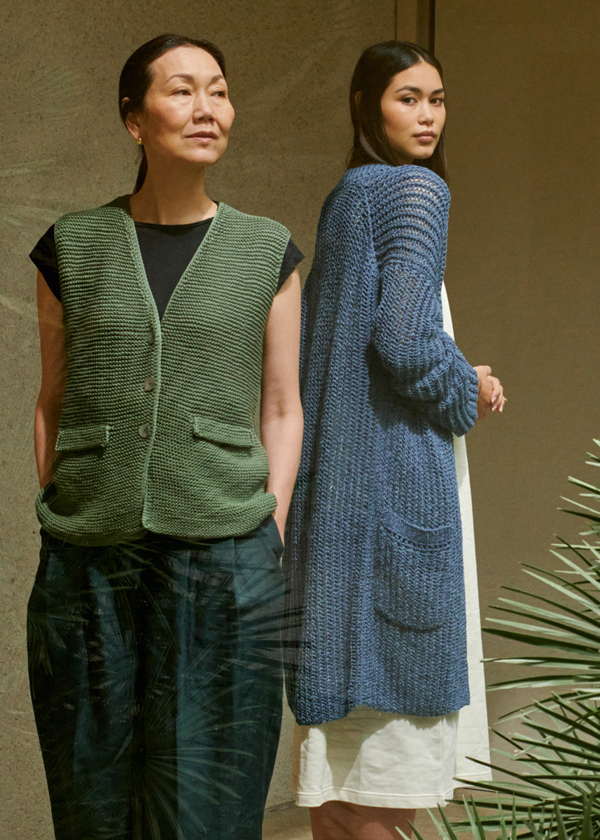 Lana Grossa-kvalitet „Bacca” (100 % bomull, löplängd = ca. 120 m/50 g): ca. 700 g jeans (färg 5); rundstickor nr. 3,5, 60 och 120 cm lång.