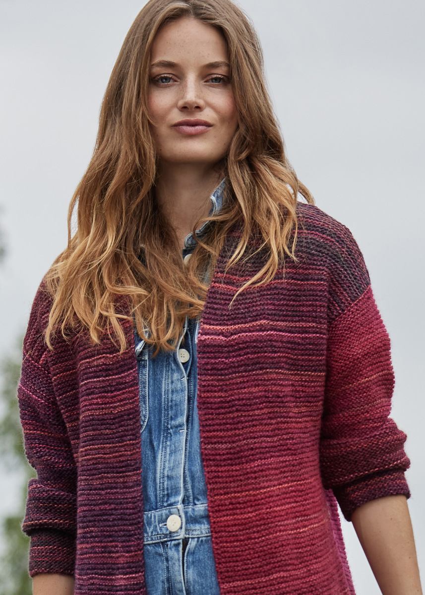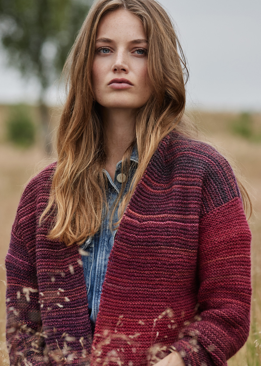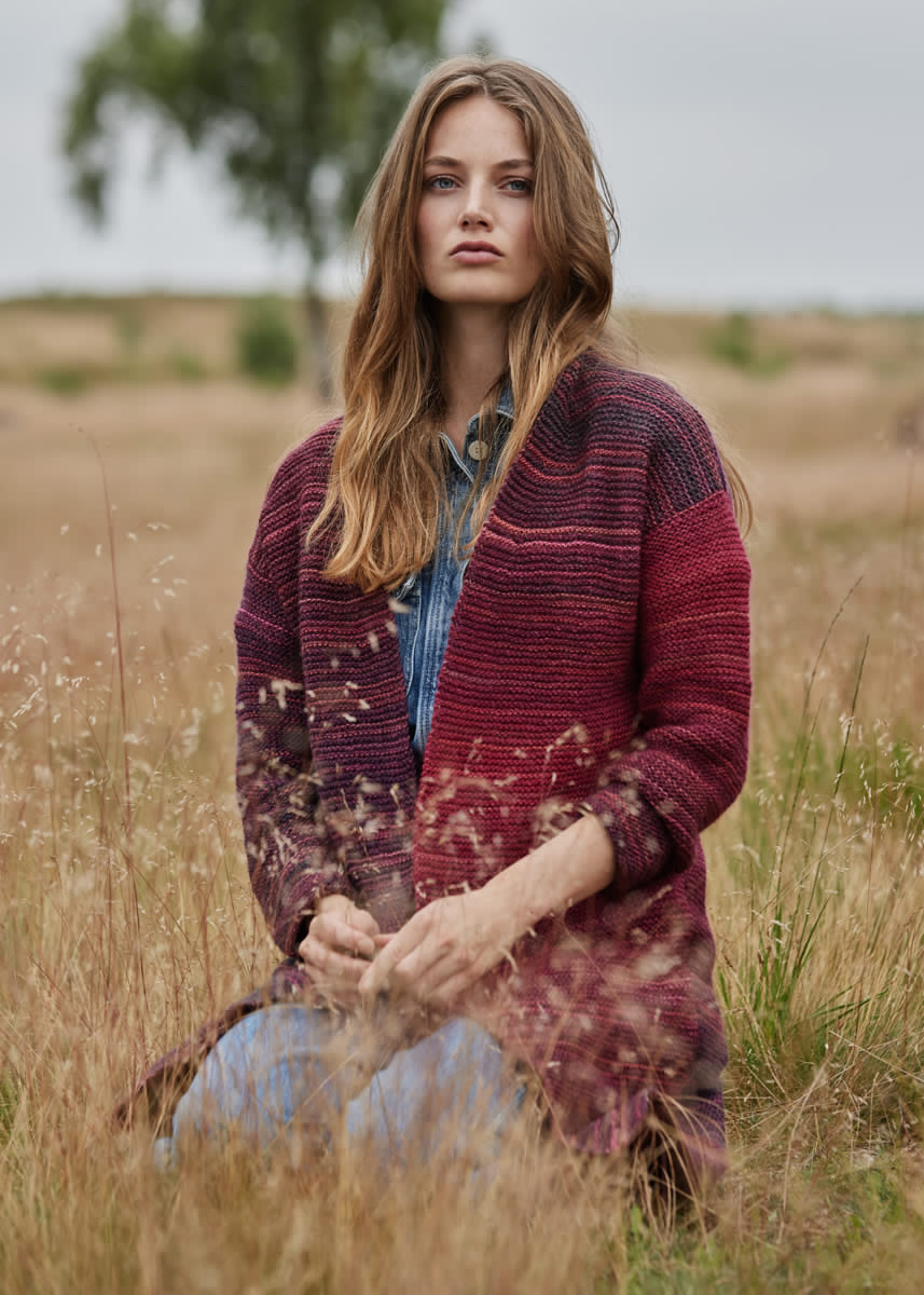 Lana Grossa-kvalitet „Gomitolo Maya“ (60 % ren ny ull, 40 % polyacryl, löplängd = ca 700 m/200 g): ca 400 (600 - 600 - 600) g fuchsia/vinröd/svartröd/aubergine/pink (färg 855); stickor nr. 3,5.