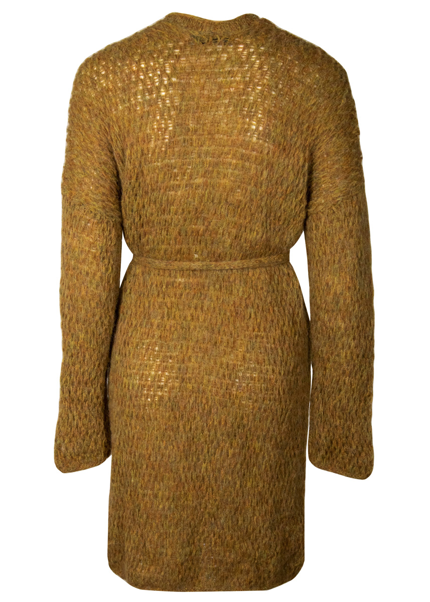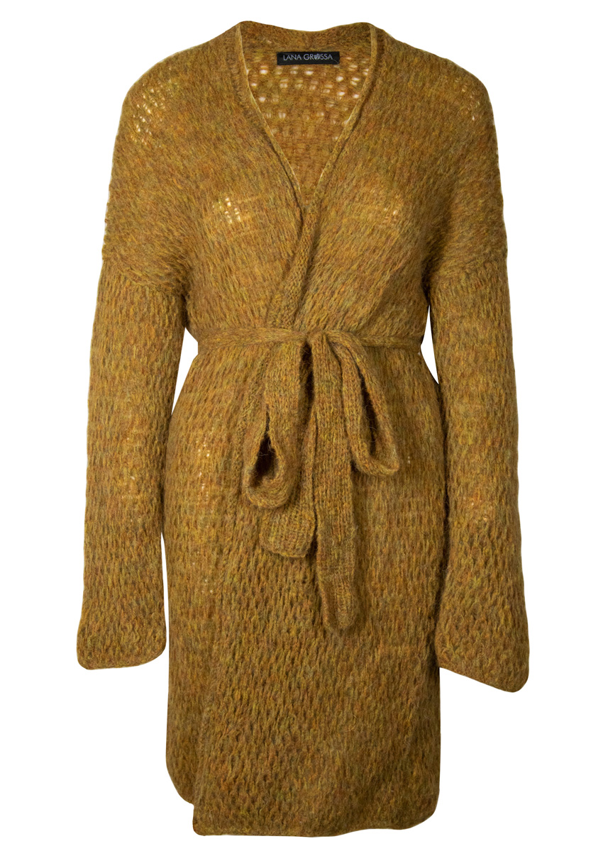 Lana Grossa-kvalitet „Nuvoletta” (42 % (baby) alpakka, 42 % ren ny ull (merino extrafin), 16 % polyamid, løpelengde = ca. 250 m/50 g): ca. 300 (350) g sennep (farge 11); strikkepinner nr. 4 og 4,5, 1 rundpinne nr. 4,5, 100 cm lang.