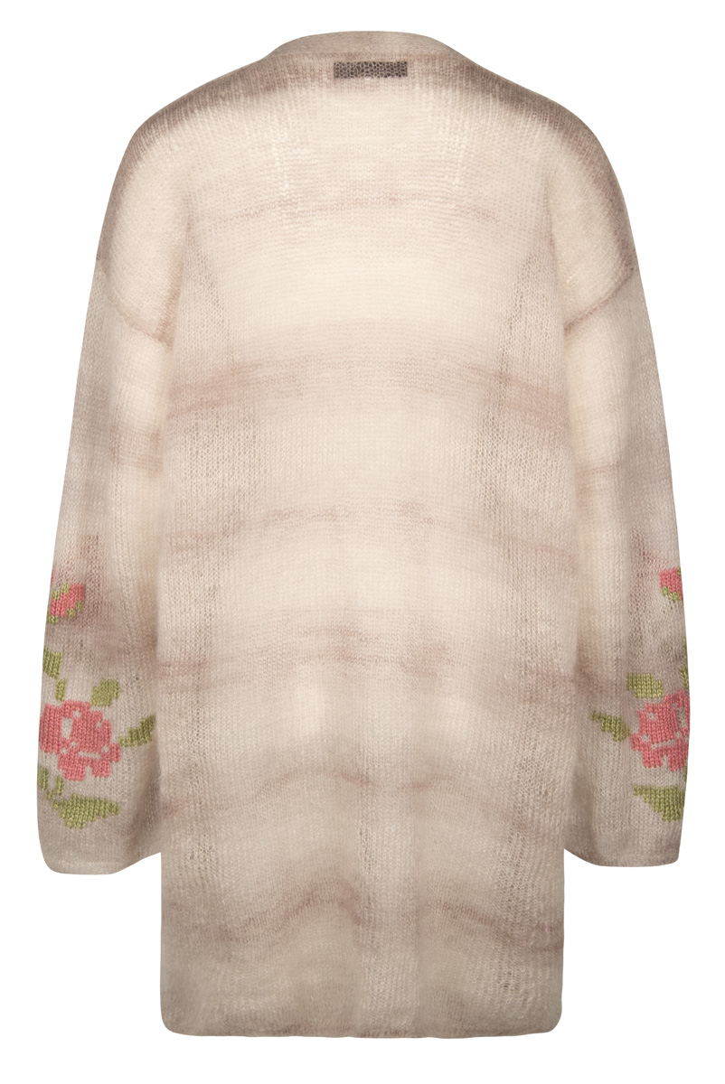 Lana Grossa-kvalitet „Silkhair Haze Dégradé” (70 % mohair (superkid), 30 % silke, löplängd = ca. 425 m/50 g): ca. 200 (250) g gråbeige/taupe (färg 1109) och till brodering Lana Grossa-kvalitet „Linarte” (40 % viskos, 30 % bomull, 20 % lin, 10 % polyamid, löplängd = ca. 125 m/50 g): ca. 50 g var i oliv (färg 87) och gammalrosa (färg 84); stickor nr. 3,5 och 5, 1 ullvirknål nr. 4, 1 ullnål von Lana Grossa till brodering.