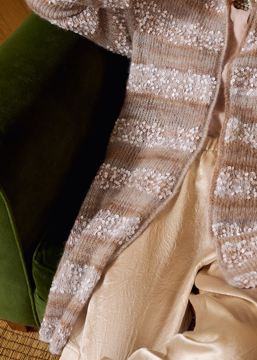 Garn: Lana Grossa «Superkid Seta» (65 % mohair (superkid), 35 % silke, LL = ca. 100 m/25 g): Ca. 225 (250 - 275 - 300) g krem/beige/sølvgrå (frg 101), Lana Grossa «Cosmo» (100 % bomull (pluss paljetter), LL = ca. 260 m/100 g): 200 (200 - 300 - 300) g hvit (frg 1).