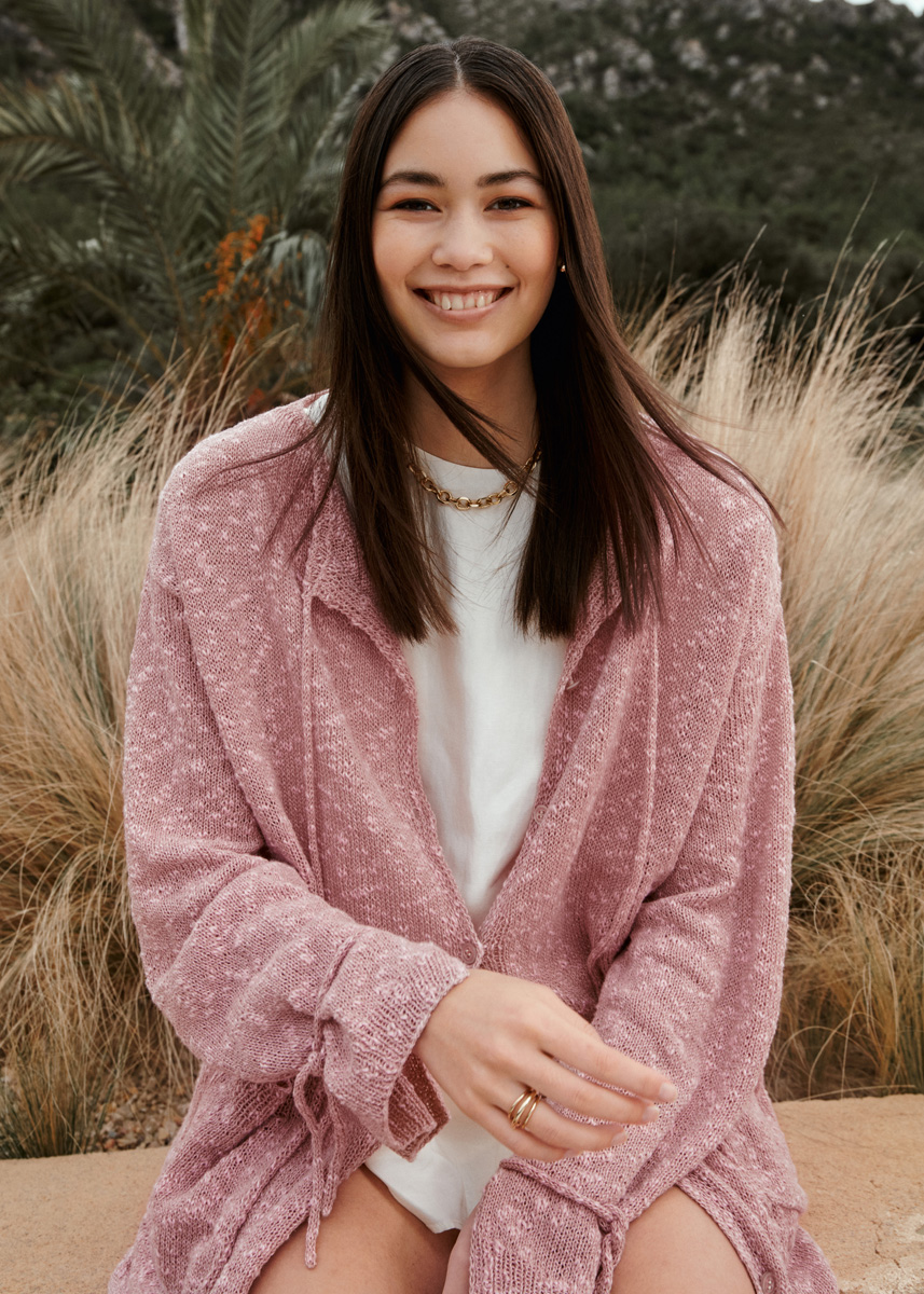 Lana Grossa-kvalitet „Terra” (58% Leinen, 42% bomull, löplängd = ca. 170 m/50 g), 650 (700 – 750) g rosa (färg 1); stickor nr. 3 och 3,5, 6 knappar från UNION KNOPF, färg ljusrosa, storlek 17 mm, 1 sticklisa från PRYM.