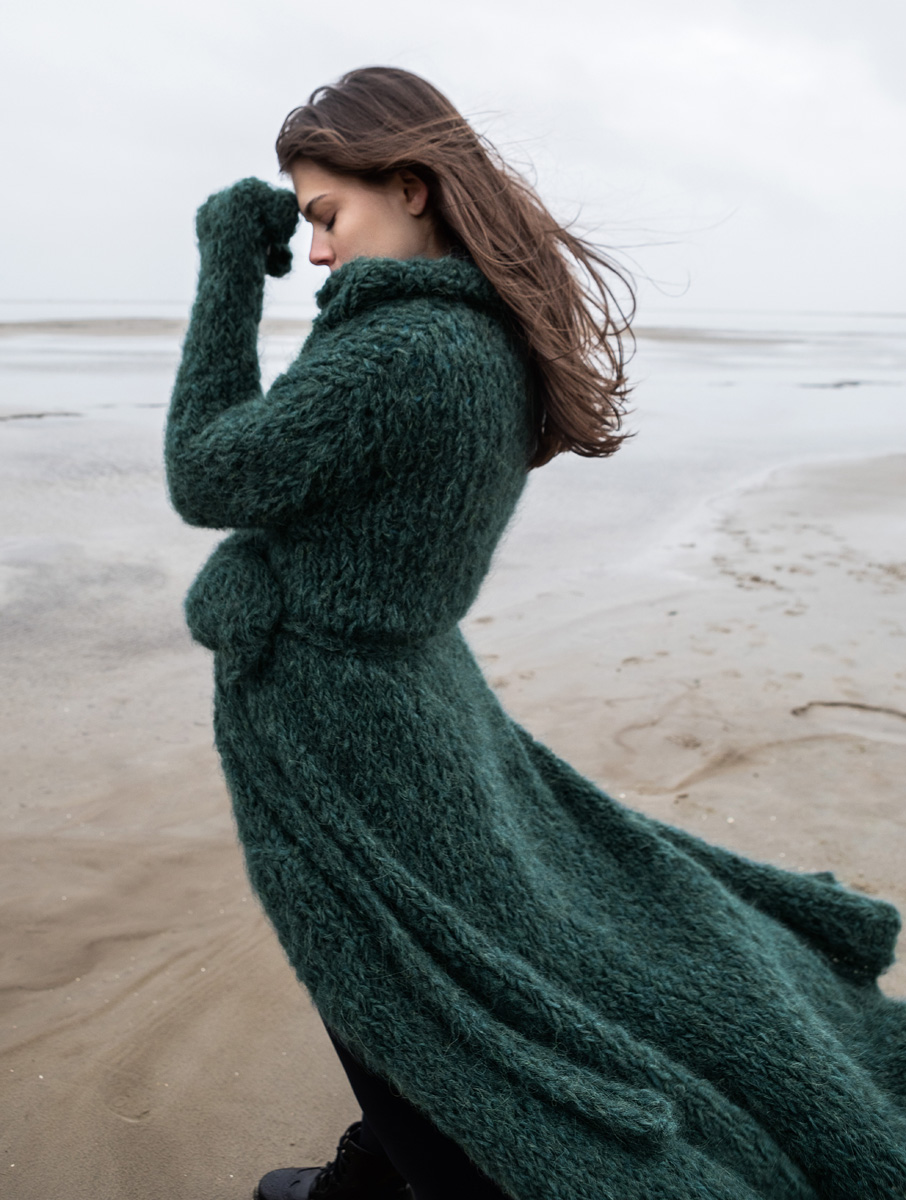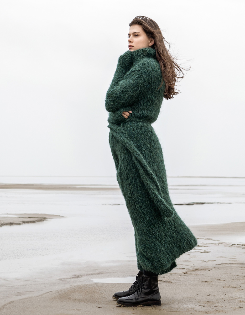 Lana Grossa Lala Berlin Furry (90 % alpacka, 10 % polyamid, löplängd 75 m/50 g) 550 (600 – 650) g petrolgrön (färg 9); stickor nr. 8 och 10, 40 cm lång rundsticka nr. 8 och 10, en virknål nr. 7.