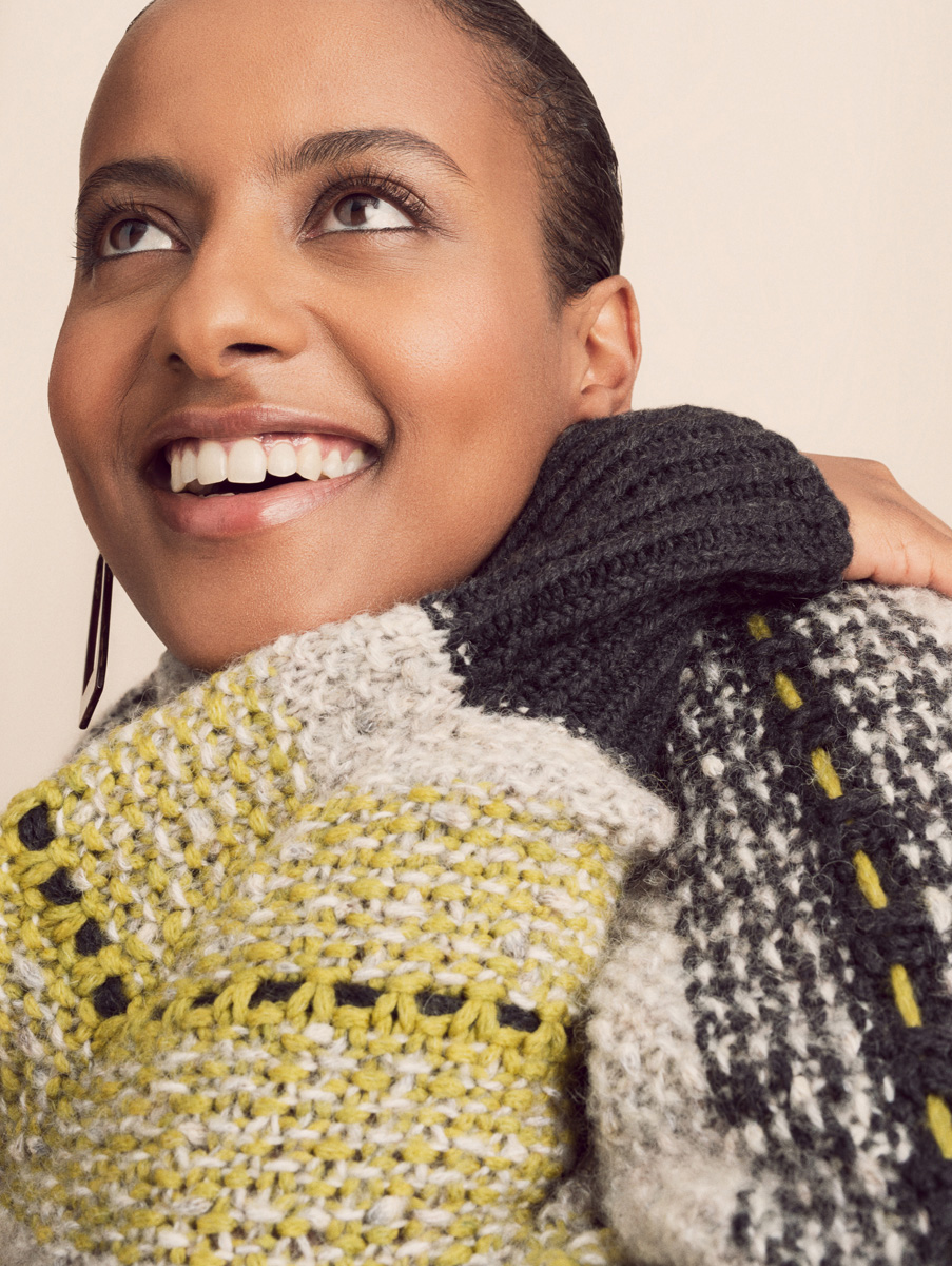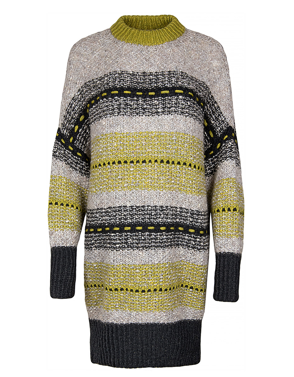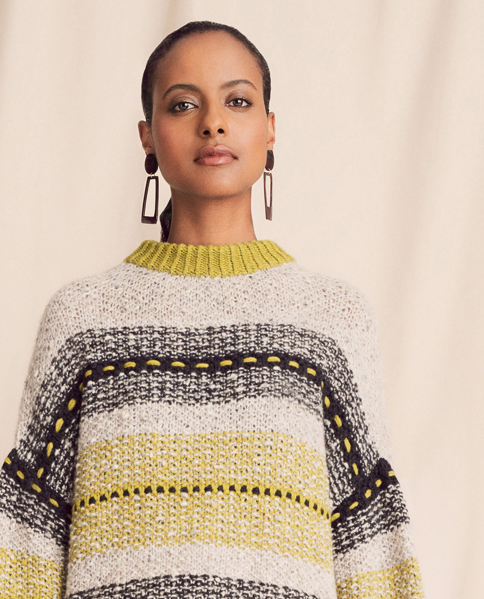 Lana Grossa-kvalitet ”Alta Moda Cashmere 16” (78 % ren ny uld 16μ, 12 % cashmere, 10 % polyamid, løbelængde = ca. 110 m / 50 gr.): ca. 200 gr antracit (fv 14) og 150 gr sennep/oliven (fv 36) og Lana Grossa-kvalitet ”Lala Berlin Fluffy” (42 % ren ny uld, 21 % polyamid, 19 % alpaka, 18 % mohair, løbelængde = ca. 130 m / 50 gr.): 300 gr natur/grège meleret (fv 103), rundpind nr. 6, 50 og 80 cm, stoppenål med et stort øje fra Lana Grossa