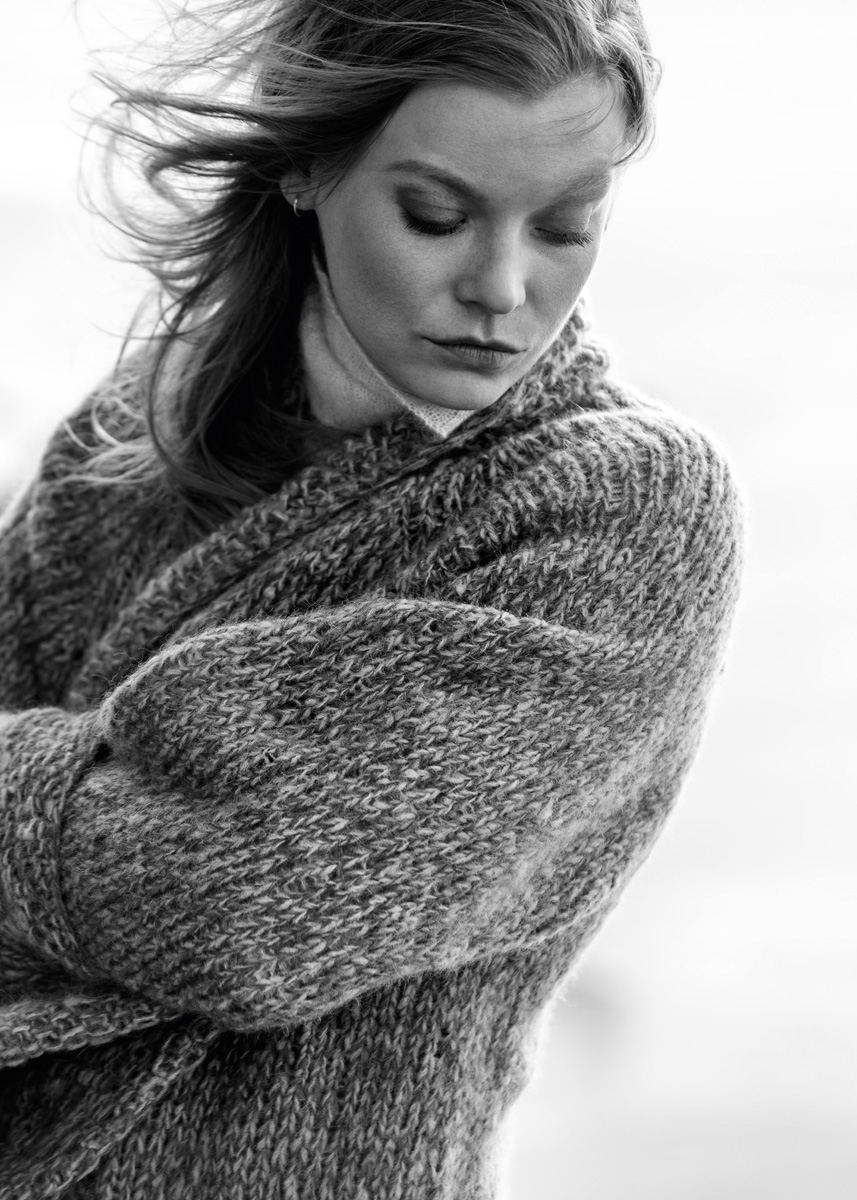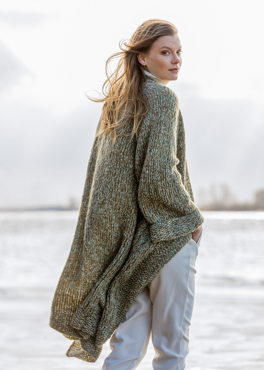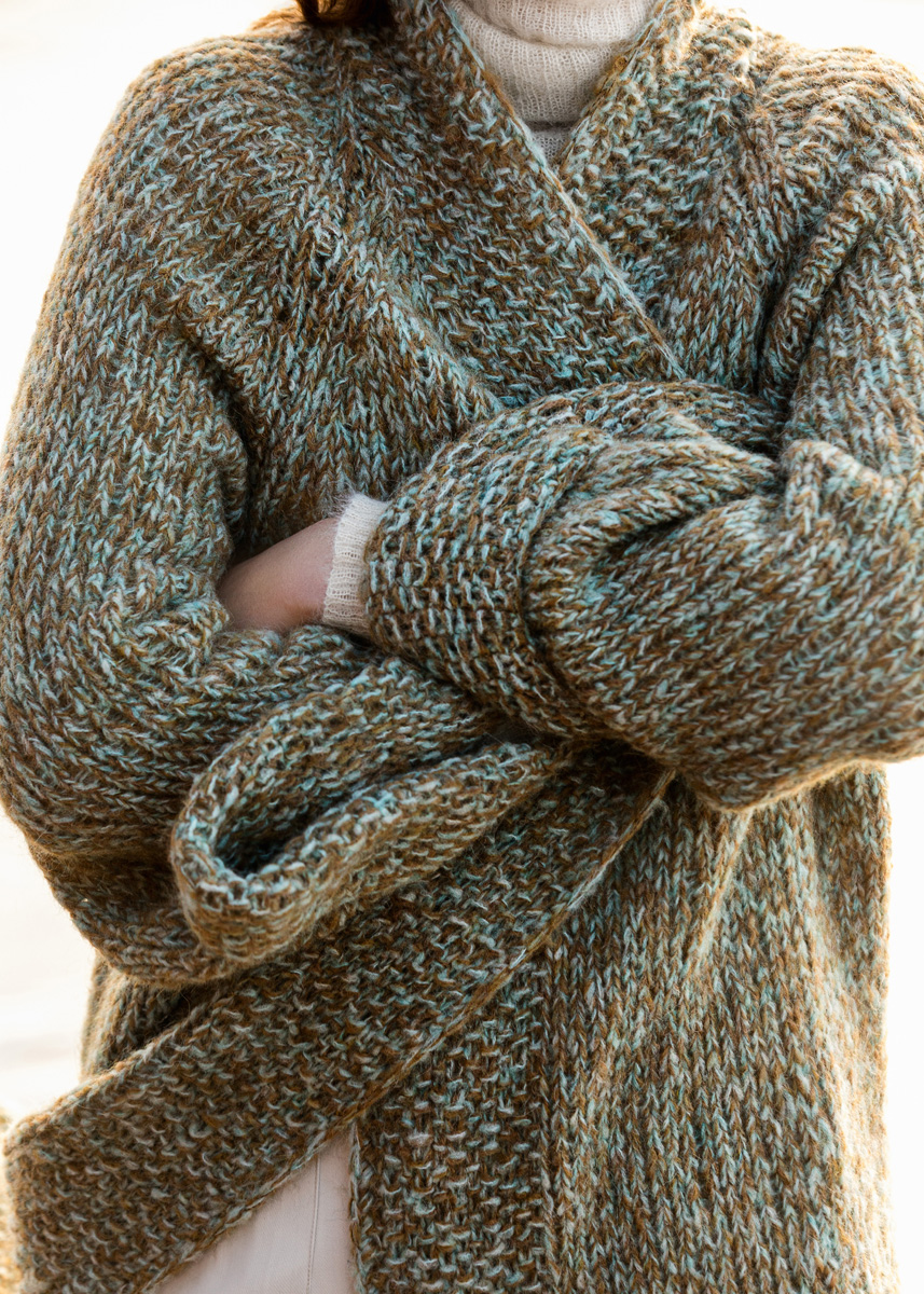 Lana Grossa-kvalitet „Nuvoletta” (42 % (baby) alpacka, 42 % ren ny ull (merino extrafin), 16 % polyamid, löplängd = ca. 250 m/50 g): ca. 250 (300 – 350) g var av kamel (färg 3) och pastellturkos (färg 9); stickor nr. 8.