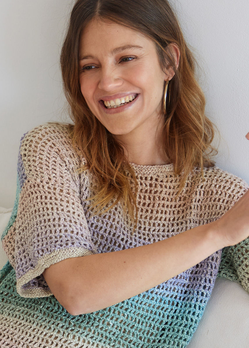 Lana Grossa-kvalitet „Gomitolo Collina“ (72 % bomull, 28 % viskos, löplängd = ca 260 m/100 g): 4 (4 - 5 - 5) nystan = ca 400 (400 - 500 - 500) g rosenträ/lila/ljusblå/mint/grège (färg 1012); virknål nr. 3,5; 1 kort och 1 lite längre rundsticka nr. 3,5.