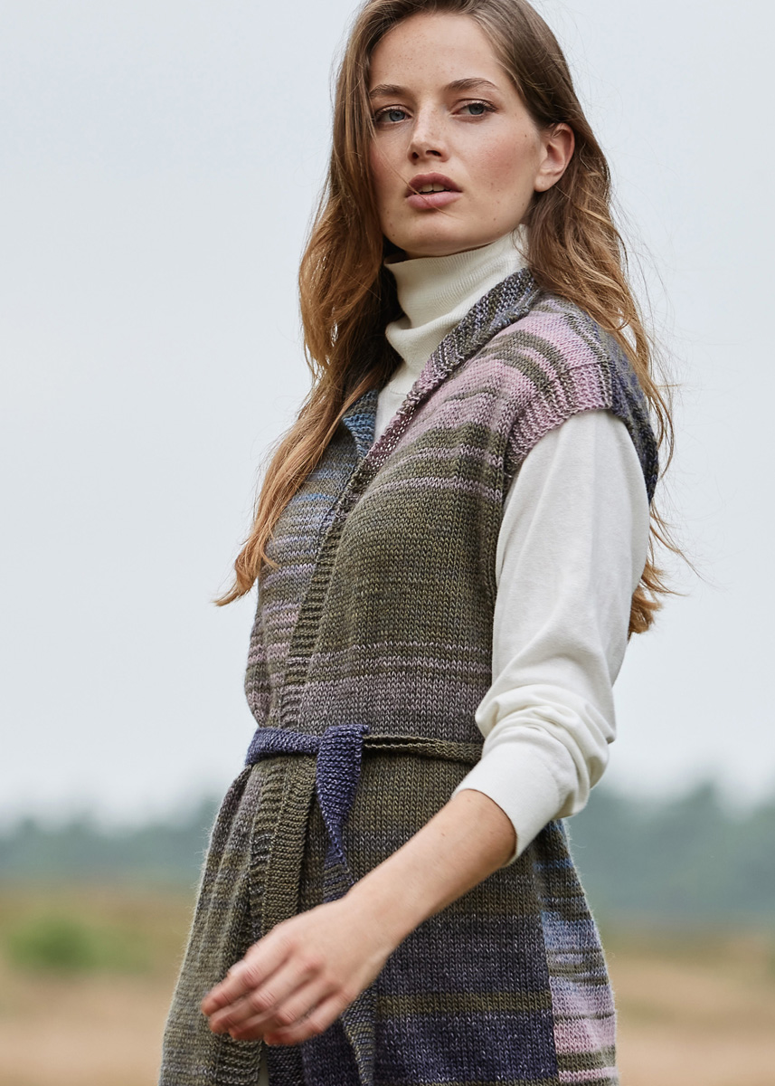 Lana Grossa-kvalitet „Gomitolo Bene“ (60 % ren ny ull, 40 % polyacryl, löplängd = ca 700 m/200 g): ca 400 (400 - 600 - 600) g mörk blå/gråbrun/rosa/violblå/marin (färg 763); stickor nr. 3,5 och 4; virknål nr. 3,5.