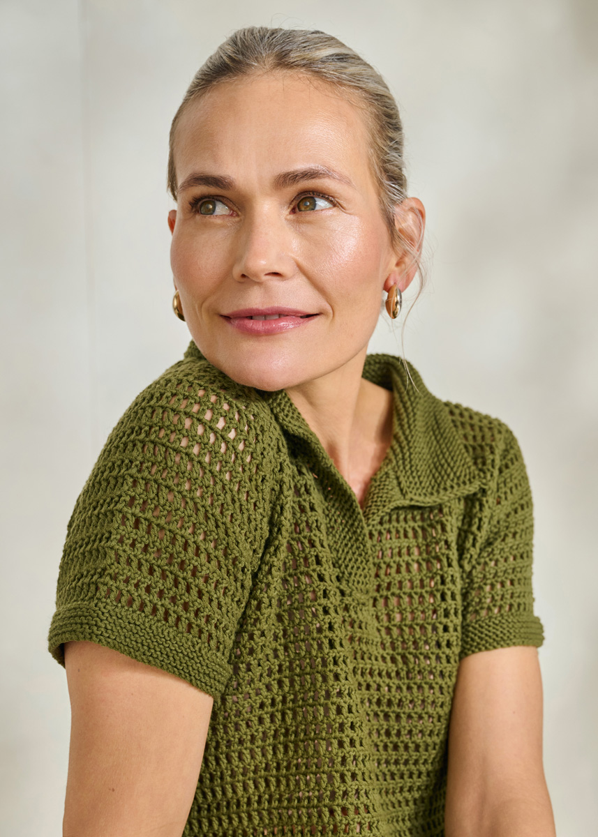 Lana Grossa-Kvalitet Landlust Baumwolle (100% bomuld (økologisk), løbelængde 115 m/50 g), 500 (550 – 600) g mosgrøn (farve 32); hæklenål nr. 3½ og rundpind nr. 4, 40 og 80 cm lang.