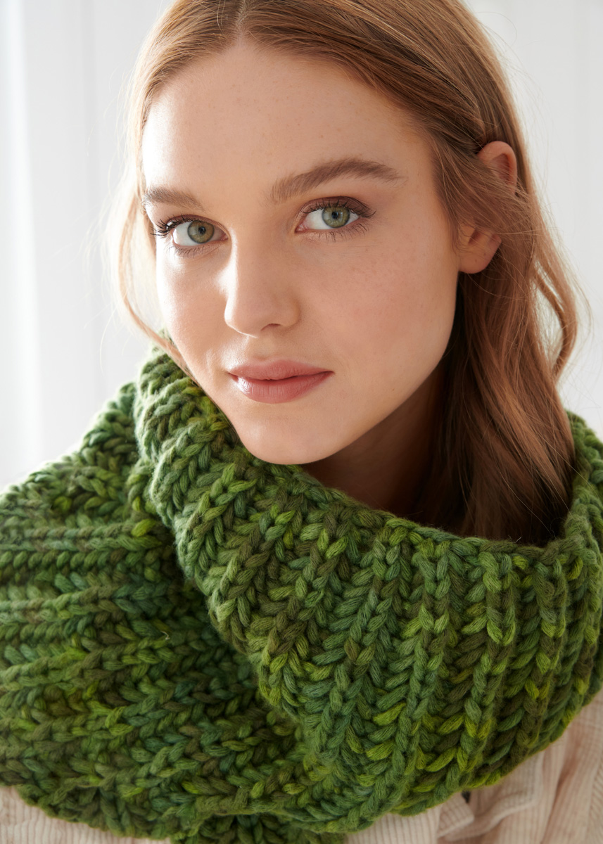 „Inizio“ från Lana Grossa 54 % ren ny ull (merino), 18 % modal, 16 % polyamid, 12 % bomull, löplängd = circa 60 meter/50 gram), circa 150 gram blad-/grangrön (färgnummer 109), Stickor nummer 10, 1 kort rundsticka nummer 10, längd 60 cm. (office@filati.no)