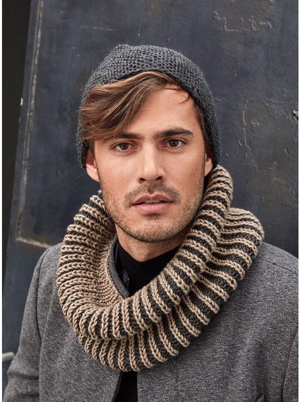 Lana Grossa-kvalitet „Bingo“ (100% virgin ull, löplängd = ca. 80 m/50 g) 100 g anthracit (färg 4) och „Bingo Mélange“ (100% virgin ull, löplängd = ca. 80 m/50 g) 100 g taupe (färg 220); en 60 cm lång rundsticka nr. 4,5