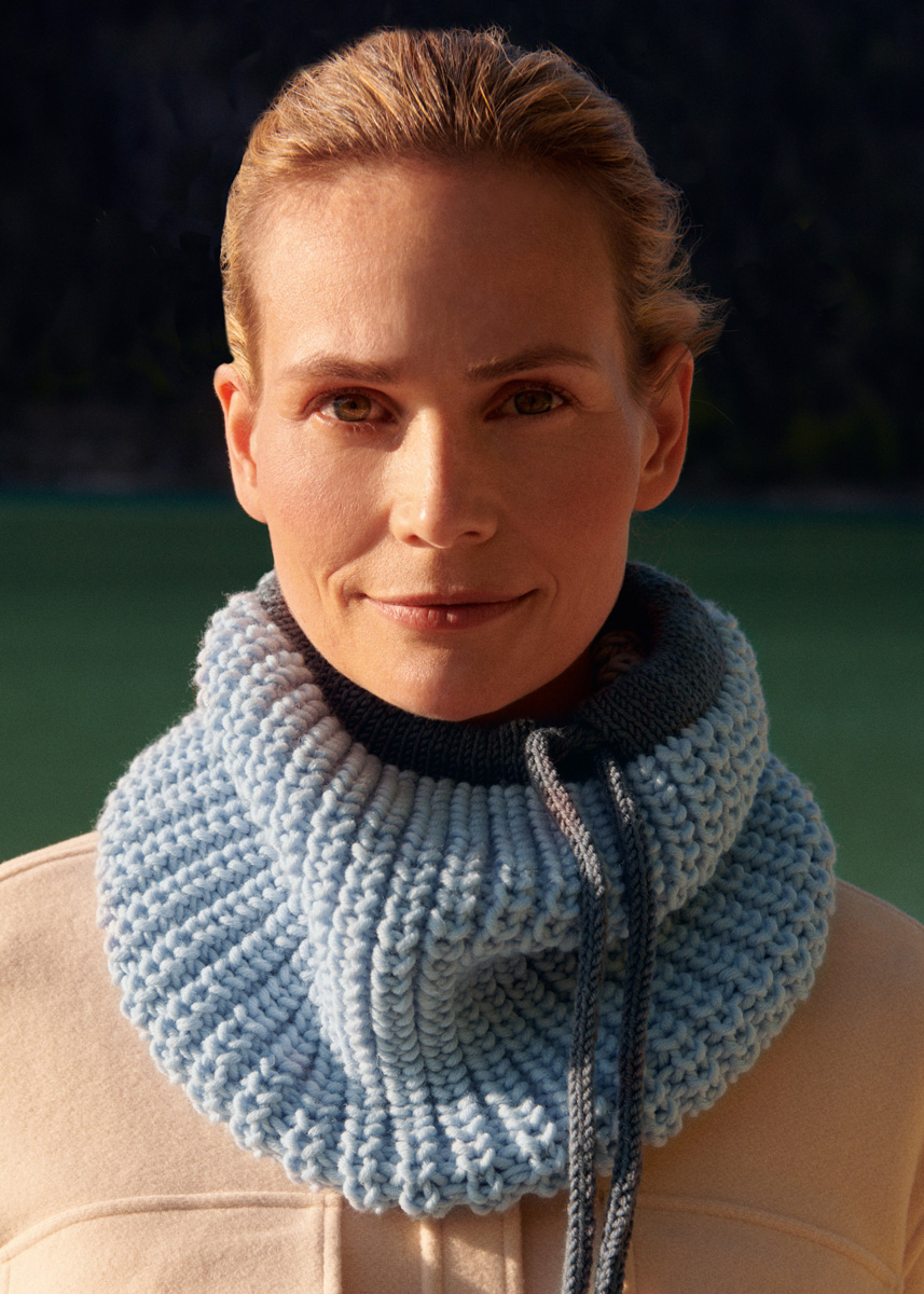 Lana Grossa Superbingo (100% ren ny ull, löplängd 55 m/50 g), 200 g ljus blå (färg 69) och Lana Grossa Cool Wool Big (100% ren ny ull, löplängd 120 m/50 g), 50 g stålgrå (färg 981); rundstickor nr. 4 och 6, 40 cm lång, 2 strumpstickor nr. 4.