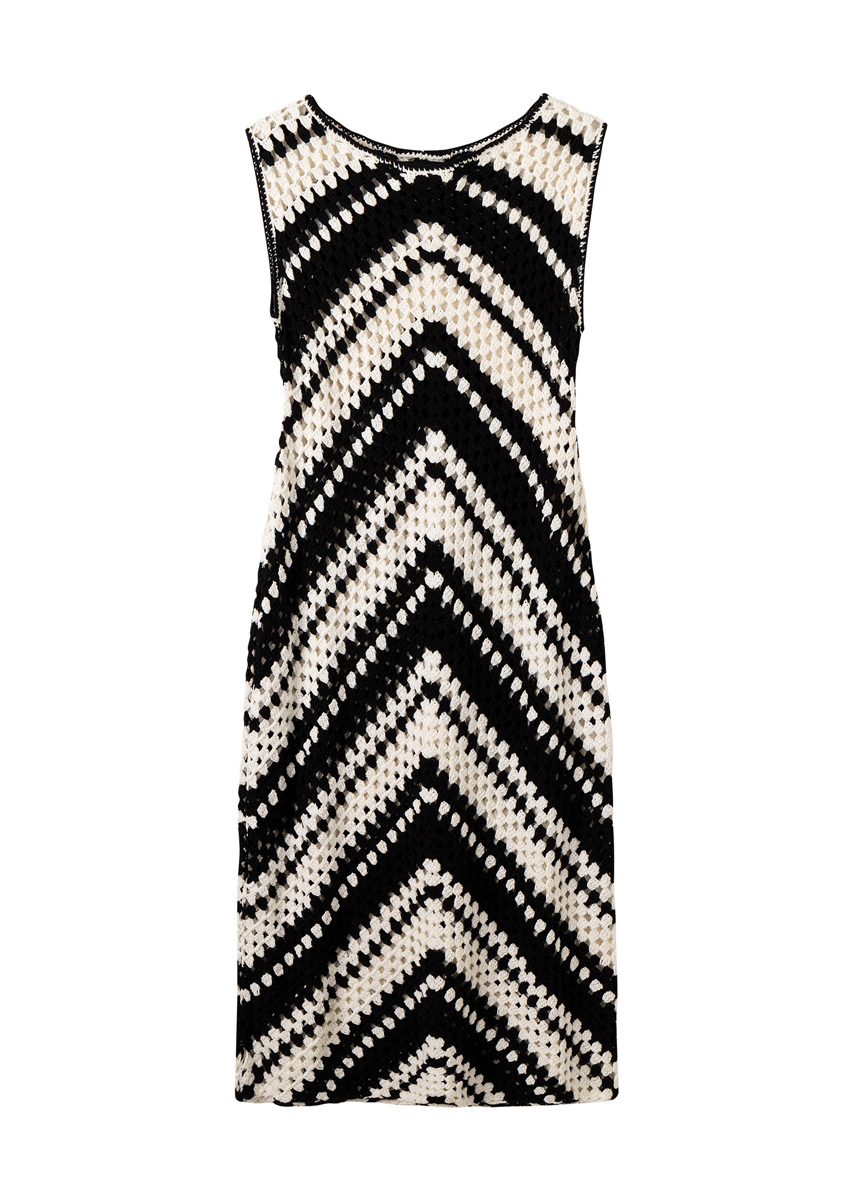 Lana Grossa-kvalitet ”Elastico” (96 % bomuld, 4 % polyester (elité), løbelængde = ca. 160 m / 50 gr): ca. 300 gr sort (fv 24) og ecru (fv 36), hæklenål nr. 3.