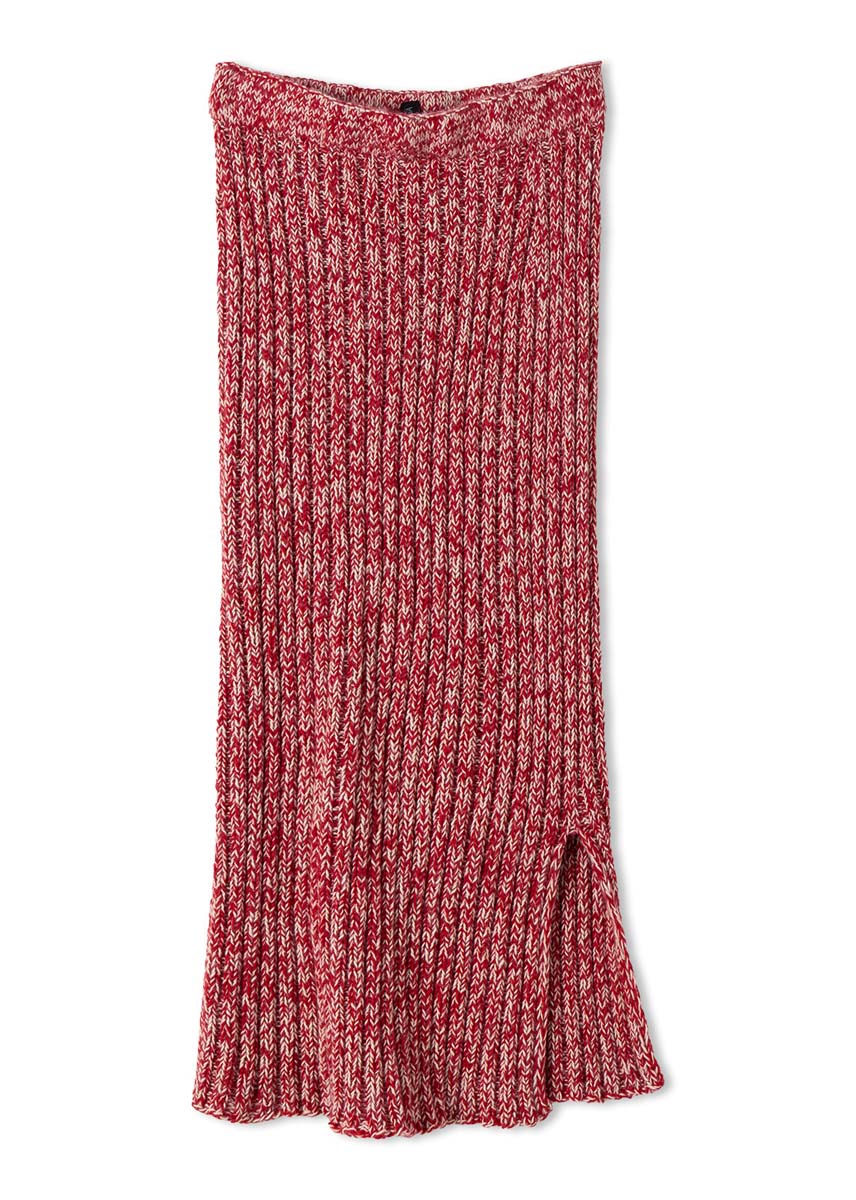 Lana Grossa Ecopuno (72% bomull, 17% ny ull (merino), 11% (baby) alpakka, løpelengde = ca. 215 m/50 g), 250 (300 - 350) g i perlebeige (farge 66) og 250 (300 - 350) g i kirsebærrød (farge 47); 80 cm lang rundpinne nr. 4,5; 2 maskemarkører (MM); ca. 80 (86 - 95) cm gummibånd,4 cm bred for linningen.