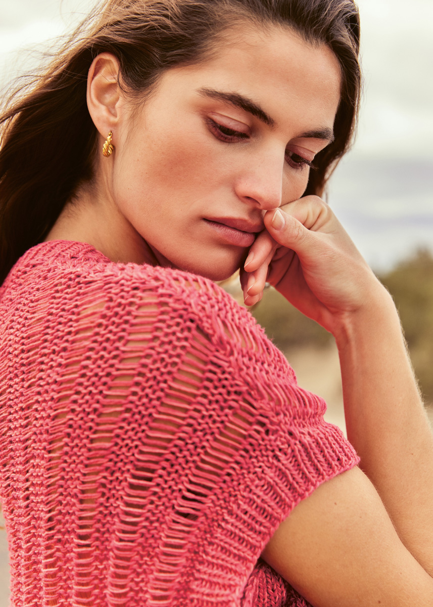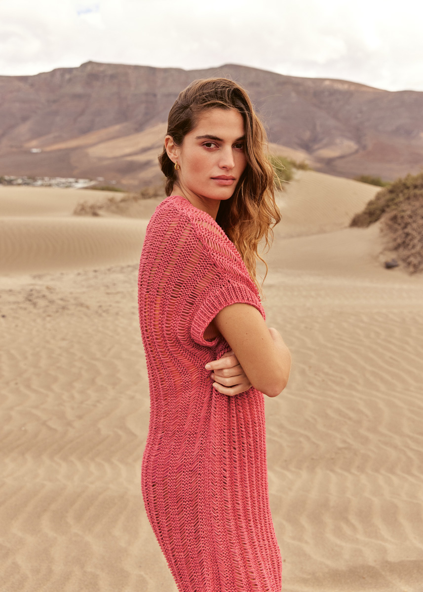 Lana Grossa-kvalitet „Linissimo” (50 % lin, 50 % bomull, löplängd = ca. 187 m/50 g): ca. 150 (200) g jordgubberöd (färg 6) och Lana Grossa-kvalitet „Solo Lino” (80 % återvunnen lin (viskos), 20 % lin, löplängd = ca. 120 m/50 g): ca. 250 (300) g flamingorröd (färg 67); stickor nr. 4 och 5, 5, rundstickor nr. 4, 40 och 60 cm lång, 1 ullnål nr. 4. Tips: St allt med dubbla trådar, 1 tråd av var garn-kvalitet.