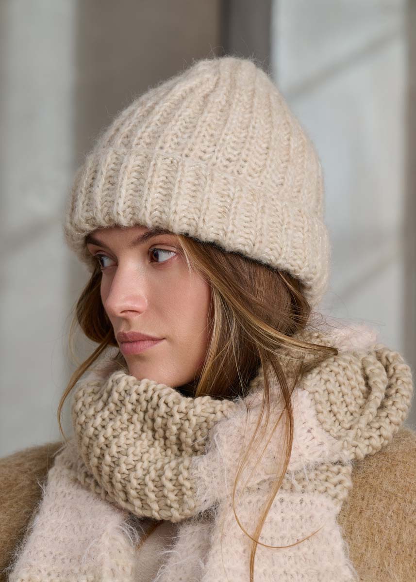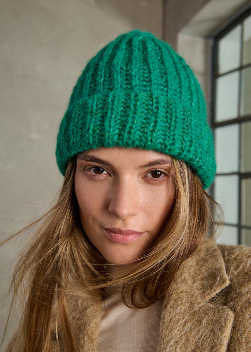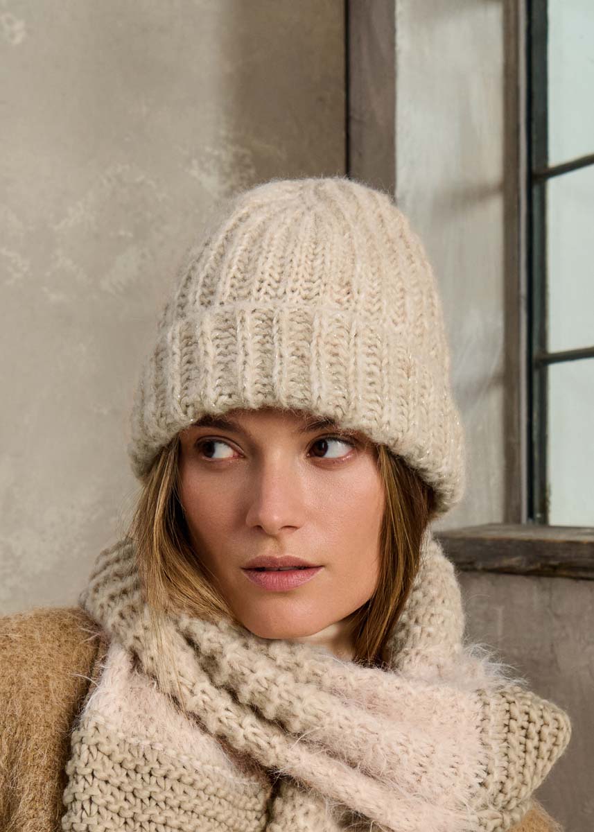 Lana Grossa „Alpaca Air“ (62% alpacka (baby), 27% polyamid, 11% ren ny ull (fin merino) löplängd= ca. 140 m/50 g), ca. 50 g beige (färg 2) ELLER ca. 50 g jadegrön (färg 24); „Brillino“ (83% viskos, 17% metallfibrer, löplängd = ca. 200 m/25 g) ca. 25 g creme/ silver (färg 32) ELLER ca. 25 g grön/silver (färg43); en rundsticka nr. 5,5, längd 40 cm, strumpstickor nr. 5,5, en maskmarkör