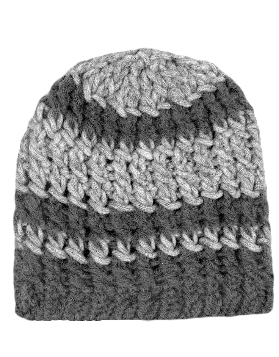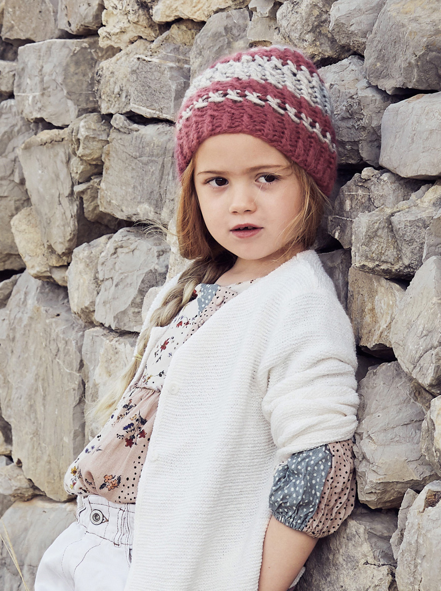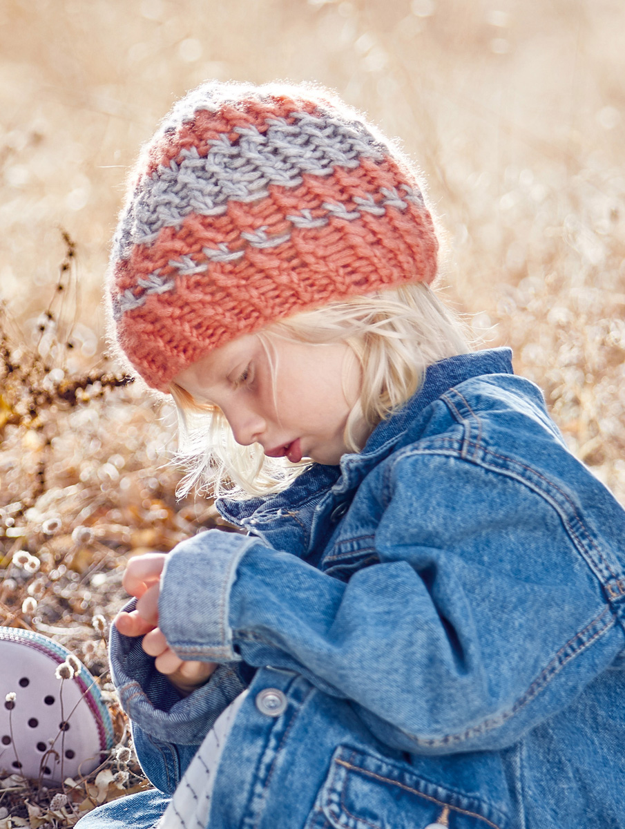Lana Grossa Lala Berlin Lovely Cashmere (60% kashmir, 25% polyamid, 15% virgin ull, löplängd 60 m/25 g), 25 (50/50) g i lax (färg 2) eller ljung (färg 3), 25 (50/50) g i grå/beige melerad (färg 9); strumpstickor nr. 9,0.
