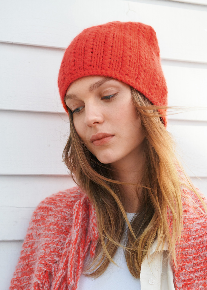 Lana Grossa „Brigitte No. 2“ (47% alpacka, 45% bomull, 8% ren ny ull; löplängd ca. 140 m/50 g), 100 g i korall (färg 25); strumpstickor nr. 7, virknål nr. 4.