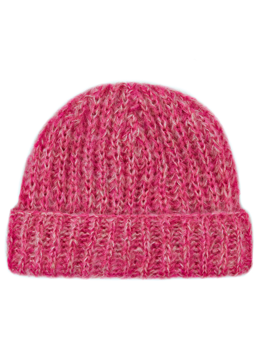 Lana Grossa-kvalitet „Brigitte No. 3“ (40 % mohair (superkid), 37 % ren ny ull, 23 % polyamid, löplängd 100 m/25 g): ca. 50 g var i puderrosa (färg 26) och pink (färg 28); strumpstickor nr. 6, 1 rundsticka nr. 6, 50 cm lång, 1 ullnålfrån Lana Grossa.