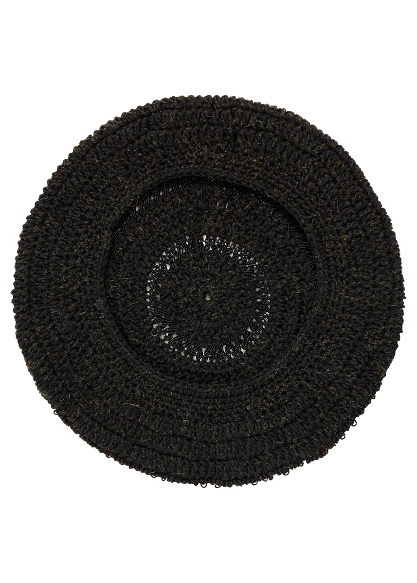 Lana Grossa Brigitte No. 4 (80% bomull, 20% alpacka (baby), löplängd 110 m/50 g), 50 g svart (färg 26) och Lana Grossa Capri (55% bomull, 30% polyamid, 15% silke, löplängd 150 m/50 g), 50 g svart (färg 16); 1 virknål nr. 3,5 och 4.