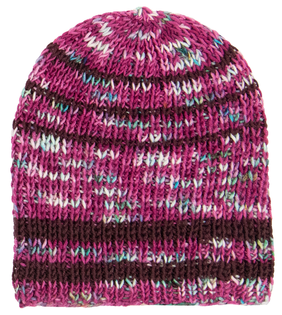 Lana Grossa-kvalitet ”Cool Wool hand-dyed” (100 % ren ny uld, løbelængde = ca. 320 m / 100 gr.): 100 gr Kolkata (fv 109) og Lana Grossa-kvalitet ”Cool Wool” (100 % ren ny uld, løbelængde = ca. 160 m / 50 gr.): 50 gr mokka (fv 2074), strømpepinde nr. 4½.