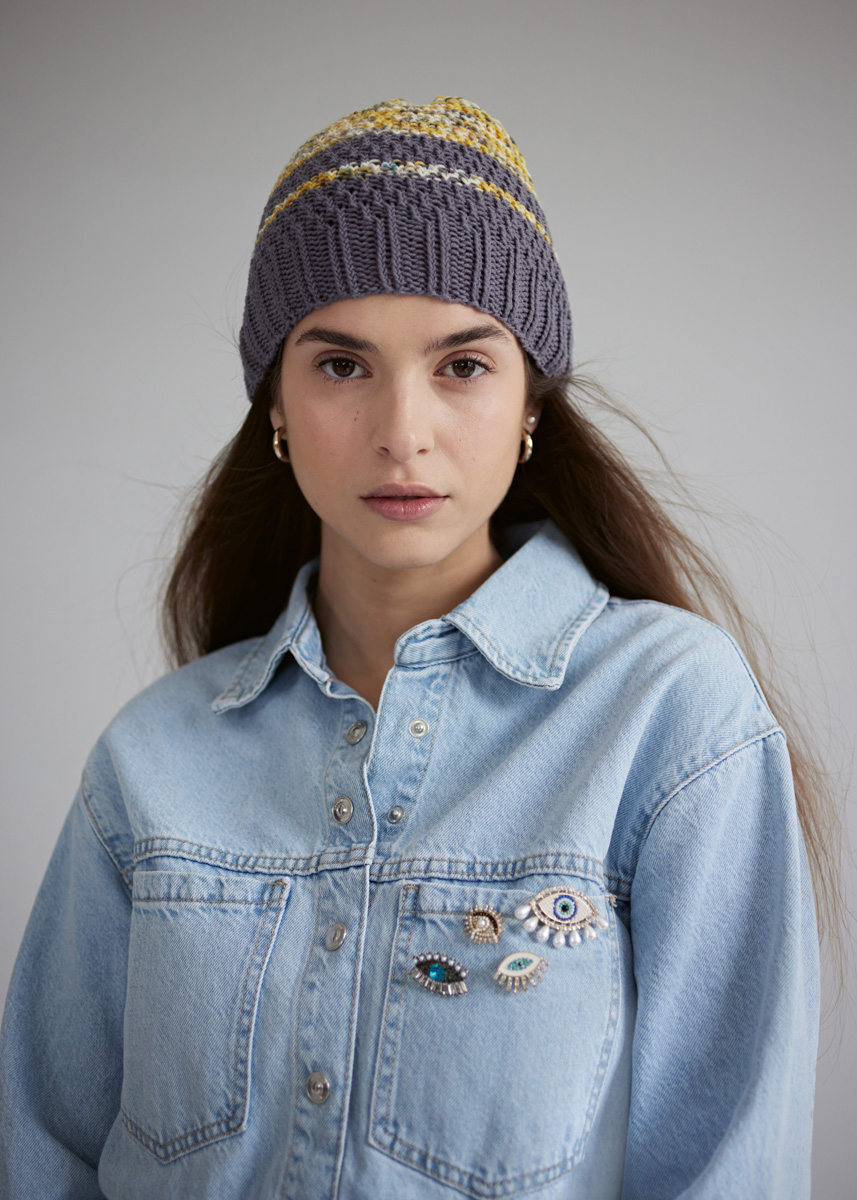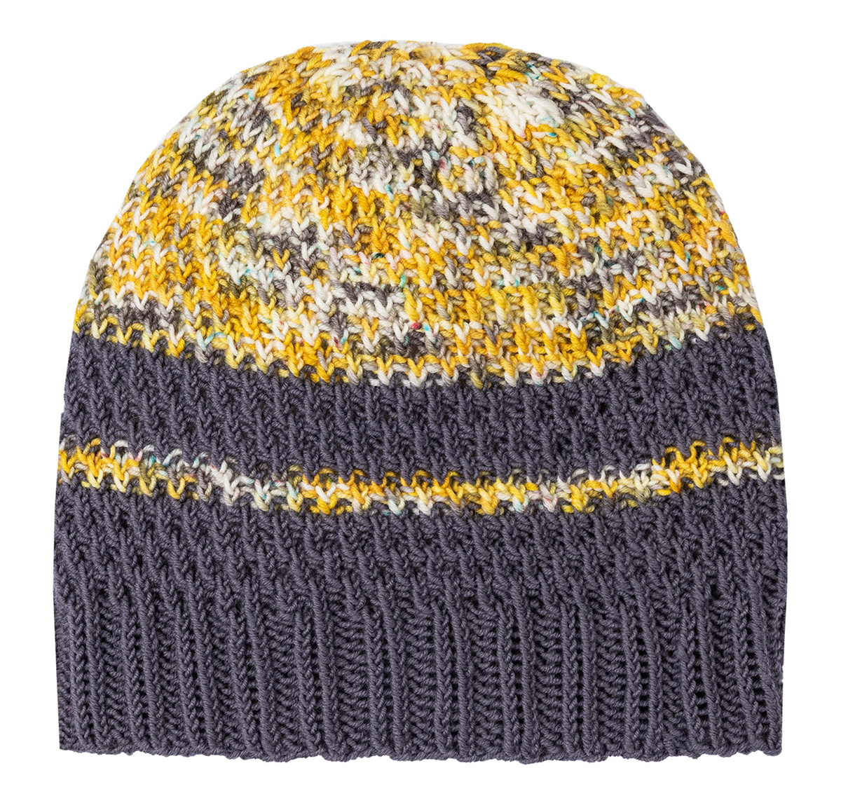 Lana Grossa-kvalitet „Cool Wool hand-dyed“ (100% ren ny ull (merino extrafin), löplängd 320 m/100 g), 100 g Laddu (färg 117) och Lana Grossa „Cool Wool“ (100% ren ny ull (merino extrafin), löplängd 160 m/50 g), 50 g skiffergrå (färg 2080), strumpstickor nr. 4.