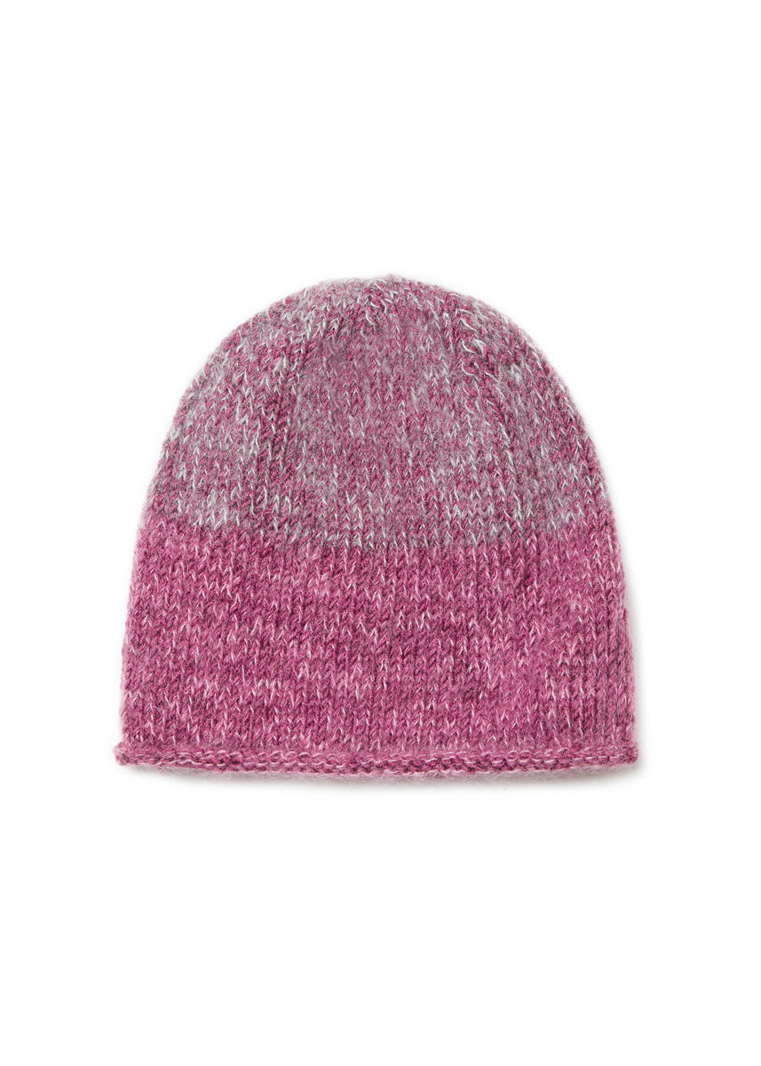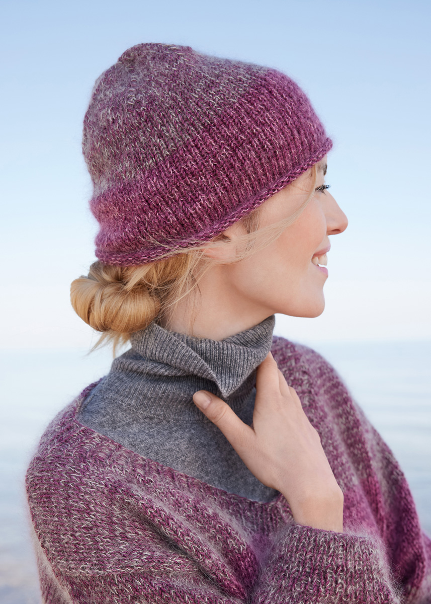 Garn: Lana Grossa Cool Wool Vintage (100 % ren ny ull (merino extrafine), LL = ca. 160 m/50 g), 50 g plomme (frg 7365). Lana Grossa Silkhair (70% mohair (superkid), 30% silke, LL = ca. 210 m/25 g), 25 g rosa (frg 162) og perlehvit (frg 58) Pinner: Fem strømpepinner nr. 4 og 4,5 Tilbehør: 6 maskemarkører (MM) Info: Strikk luen med en tråd Cool Wool Vintage sammen med en tråd Silkhair.