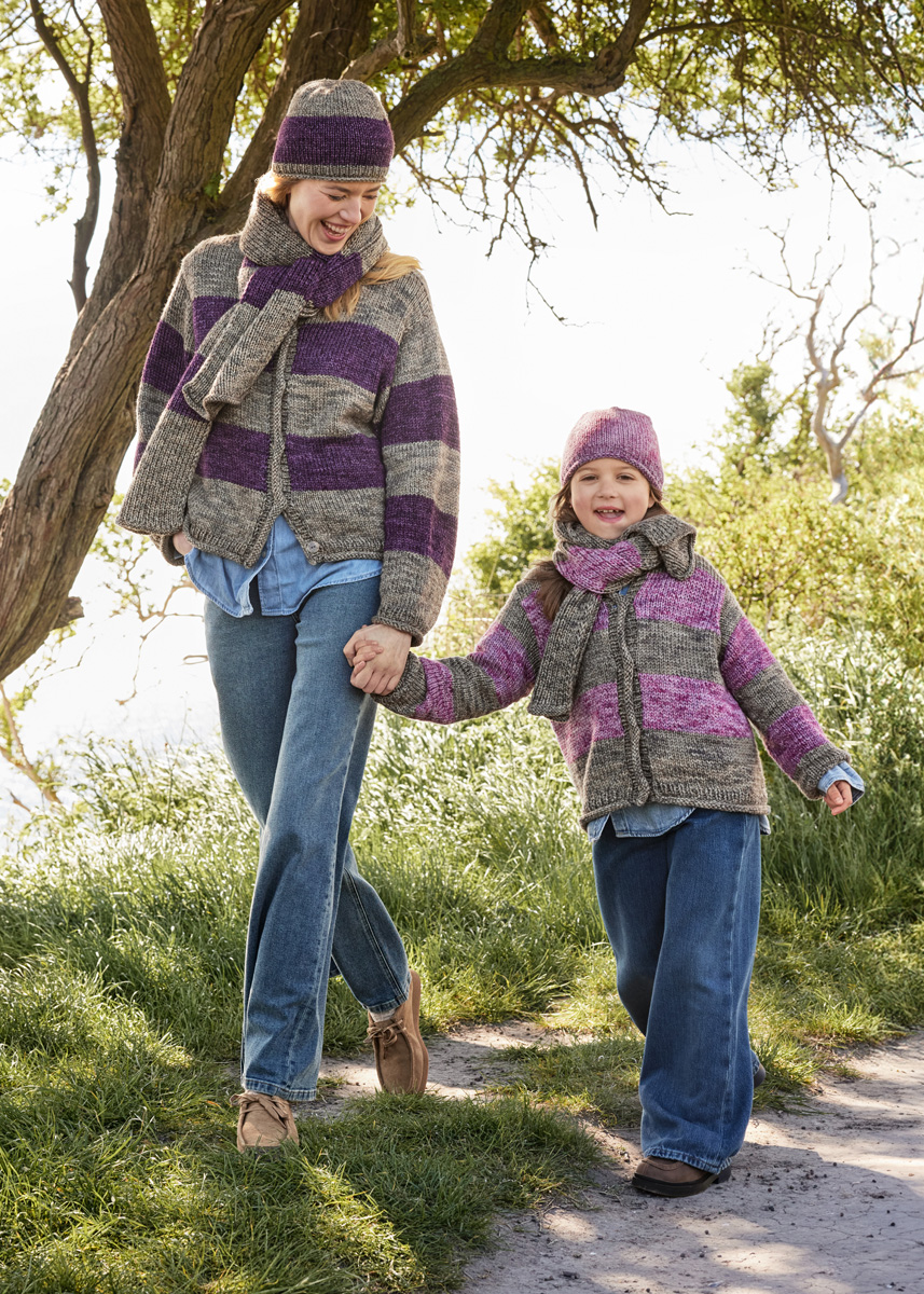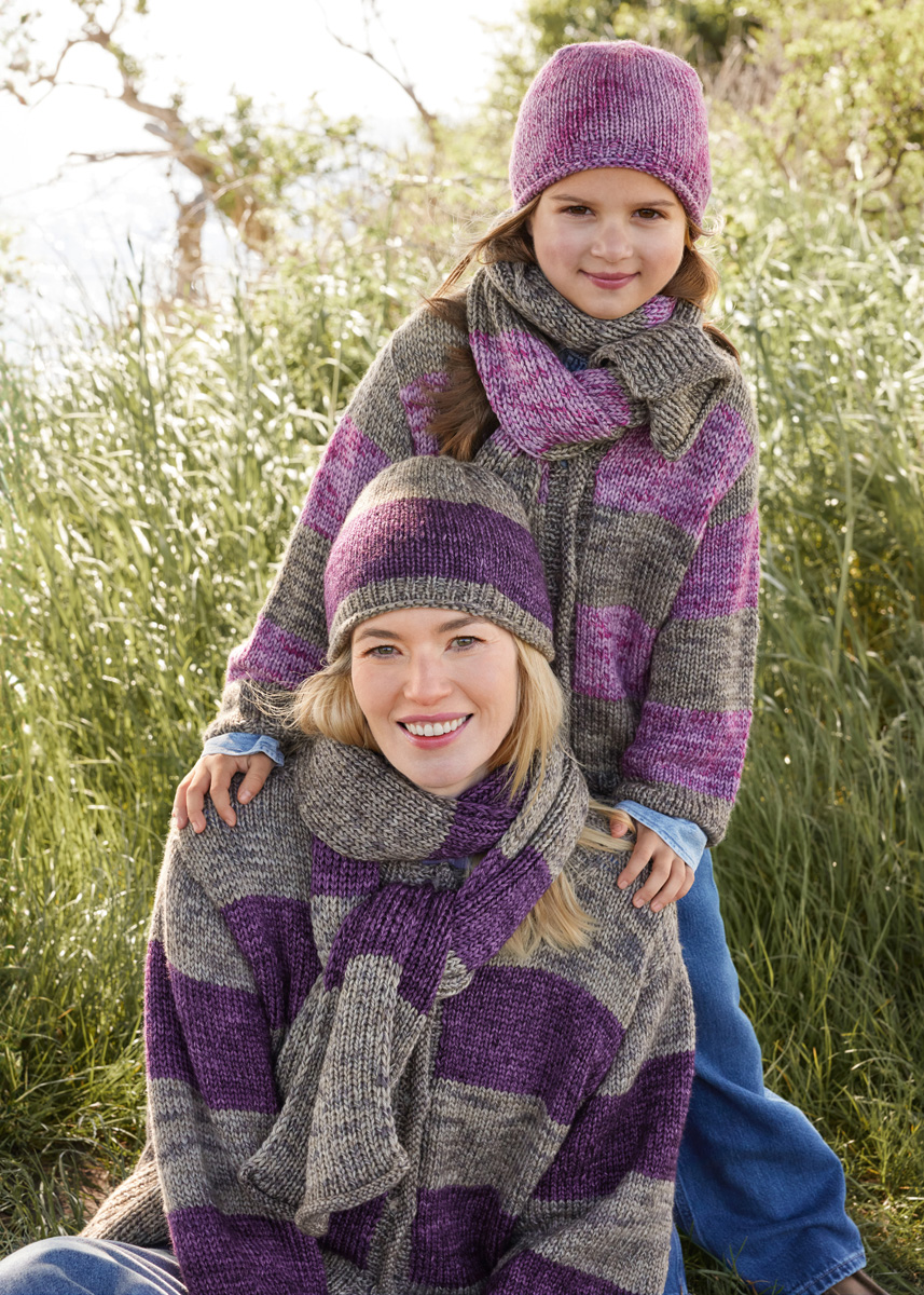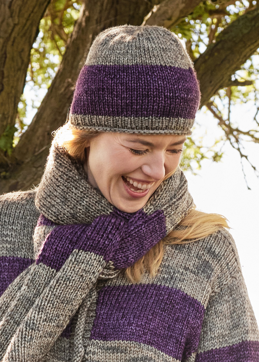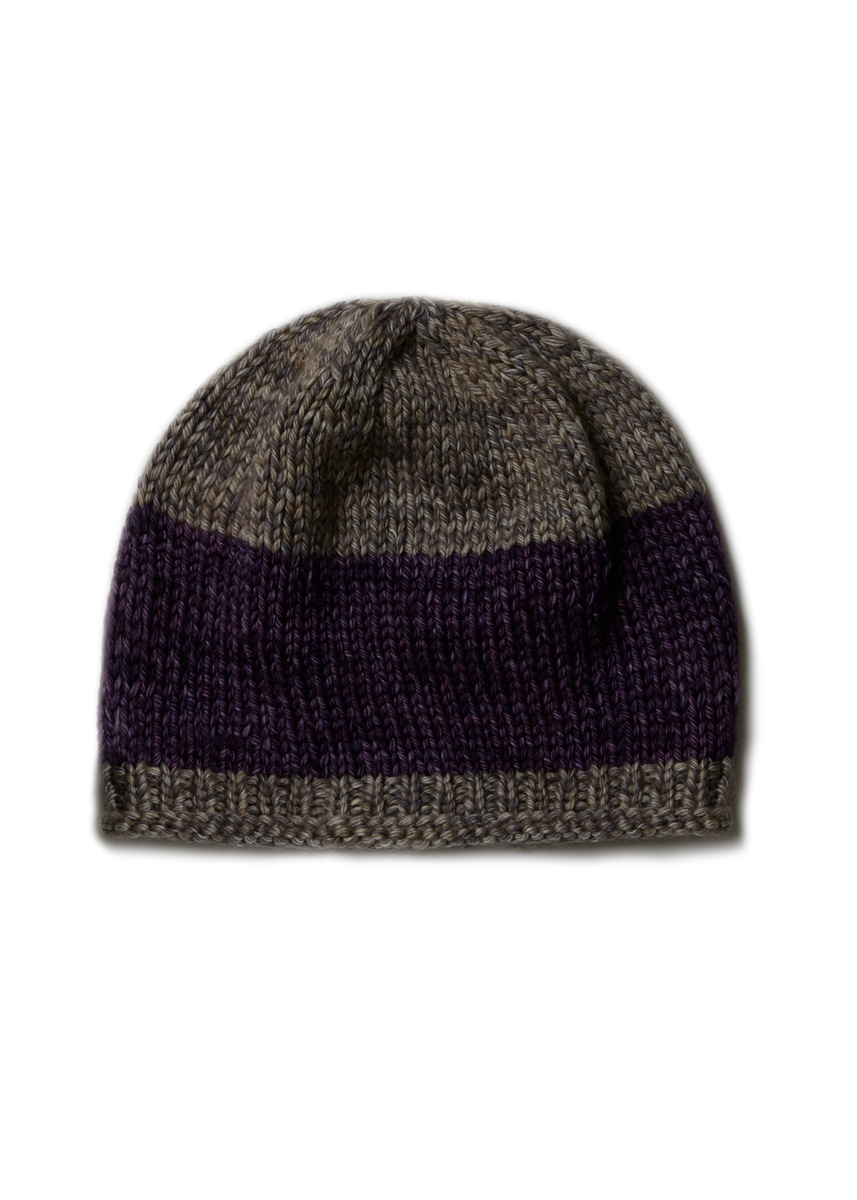 Lana Grossa Vintage Chunky (100 % ren ny ull (merino extrafine), LL = ca 80 m/50 g), 50 g antikk fiolett/aubergine (frg 8) og 50 g beige/khaki (frg 1) Pinner: Strømpepinner nr. 5 og 6 Tilbehør: 6 maskemarkører (MM)