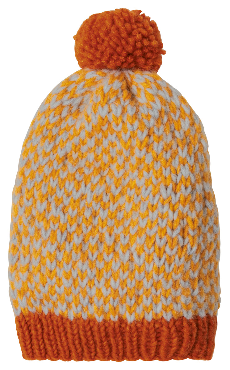 Lana Grossa kvalitet „Ecopuno Chunky“ (48% bomull, 33% ren ny ull (merino extrafine), 19% (baby) alpacka, löplängd = 70 m/50 g): 50 g gul (färg 116), 50 g ljus grå melerad (färg 124), 50 g rost (färg 115); korta rundstickor nr. 5 och nr. 7, Pompon-Set.