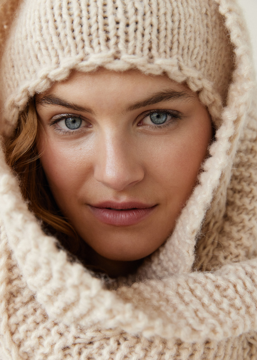 Lana Grossa Ecopuno Chunky (48% bomull, 33% ren ny ull (extrafin merino), 19% alpacka (baby), löplängd 70 m/50 g), 100 g ljus beige (färg 113); strumpstickor nr. 7 och 8.