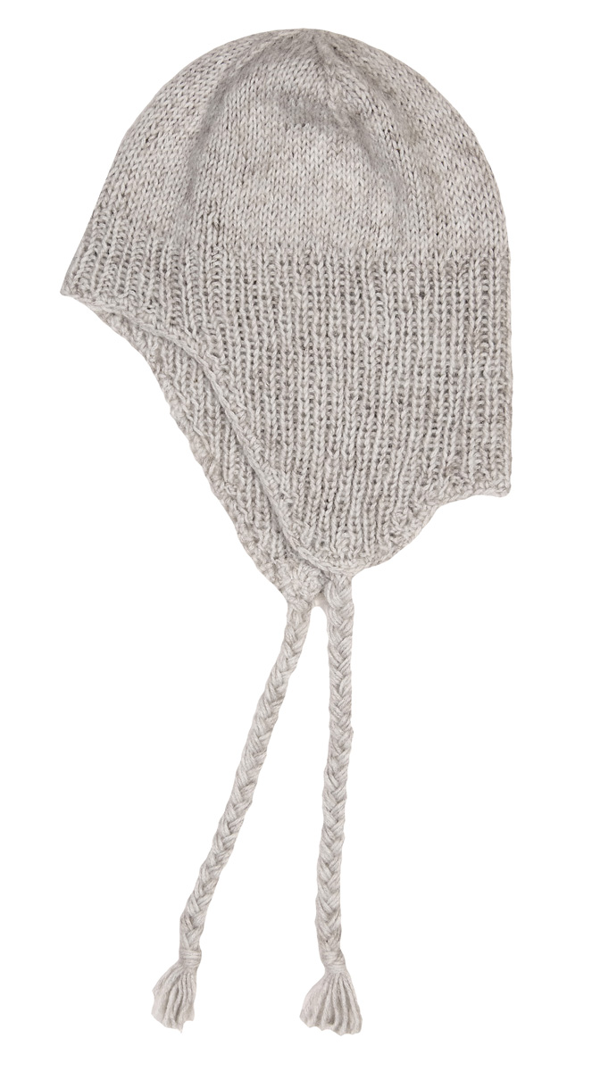 Lana Grossa-kvalitet ”Ecopuno” (72 % bomuld, 17 % ren ny merino, 11 % baby alpaka, løbelængde = ca. 215 m / 50 gr.): ca. 50 gr grège (fv 18), strømpepinde nr. 3, hæklenål nr. 2½.