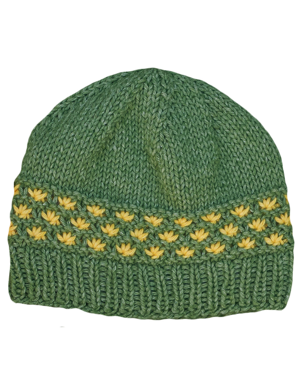 Lana Grossa-kvalitet ”Fourseason” (45 % ren ny uld (ekstrafin merino), 40 % (bio) bomuld, 15 % (rec.) cashmere, løbelængde = ca. 105 m / 50 gr.): ca. 50 gr grøn (fv 7) og 50 gr gul (fv 8), strømpepinde nr. 4½.