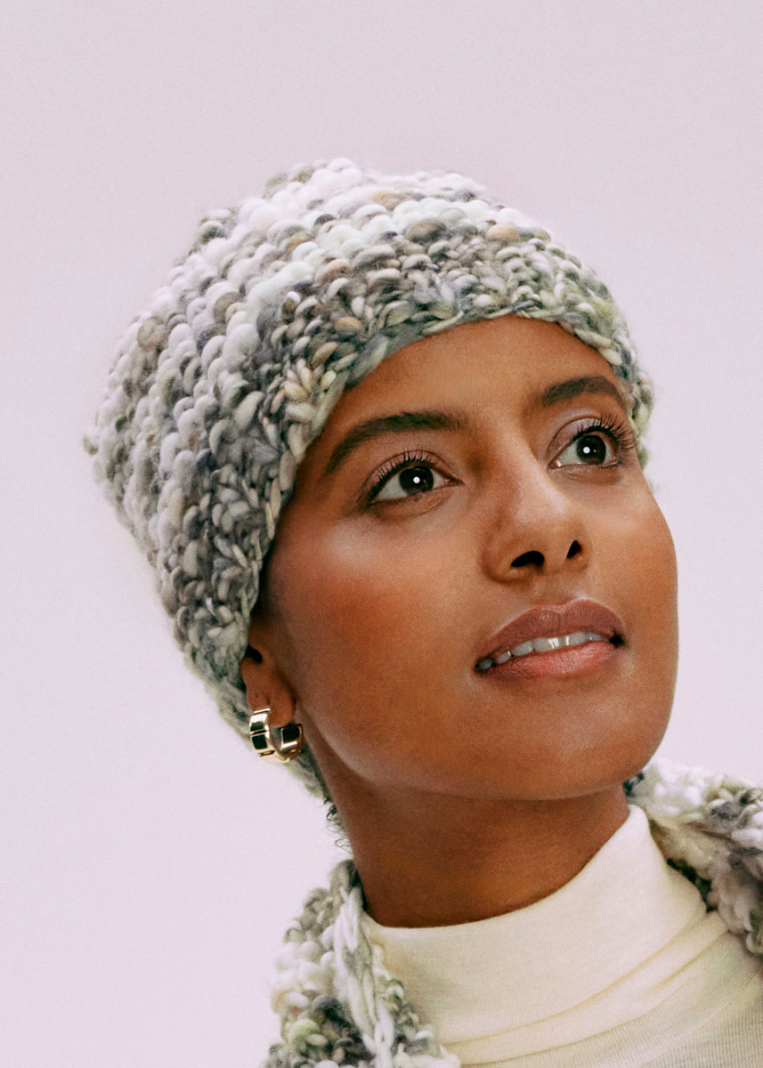 Lana Grossa-kvalitet „Lala Berlin Flamy“ (100 % ren ny ull (merino), löplängd = ca. 70 m/100 g): ca. 100 g syren (färg 11) och ca. 100 g rosa (färg 8) eller ca. 100 g råvit/beige/ grå melerad (färg 101) och ca. 100 g vit (färg 1); 1 kort rundsticka eller strumpstickor nr. 7.