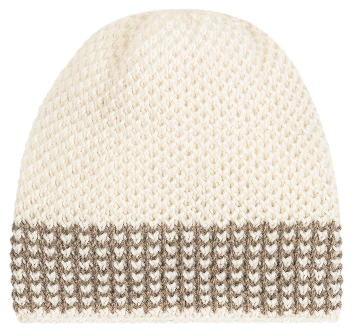 Lana Grossa Landlust Alpaka Merino 100 (50% ren ny ull (merino), 50% (baby) alpacka, löplängd 100 m/50 g), Mössa 1: 100 g råvit (färg 301) och 50 g rosa (färg 313), Mössa 2: 100 g råvit (färg 301) och 50 g taupe (färg 304), Mössa 3: 100 g råvit (färg 301) och 50 g mörk orange (färg 321); strumpstickor nr. 4 och 1 rundsticka nr. 4, 40 cm lång.