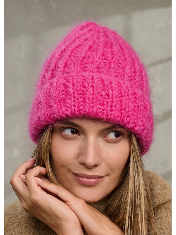 Lana Grossa „Mohair Moda“ 70% Mohair (Kid Mohair), 20% ren ny ull (merino superfin), 10% polyamid löplängd = ca. 140 m/50 g, ca. 100 g pink (färg 8), en rundsticka nr. 6, längd 40 cm, strumpstickor nr. 6; en maskmarkör; Mössan stickas med dubbla tråar