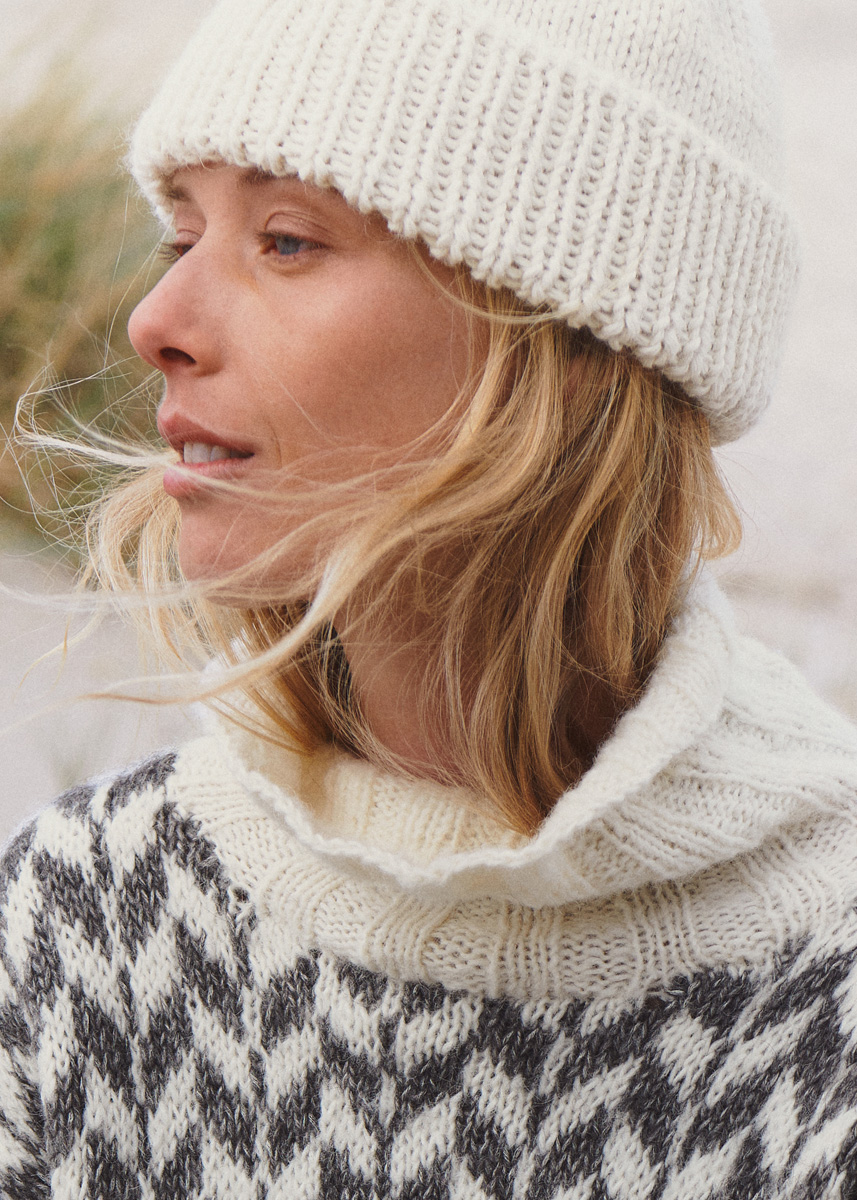 Lana Grossa-kvalitet ”Natural Alpaca Classico” (85 % alpaka (baby), 15 % ren ny uld (merino), løbelængde = ca. 125 m / 50 gr.): 150(150) gr råhvid (fv 101), rundpind nr. 5, 40 cm, strømpepinde nr. 5, maskemarkører.