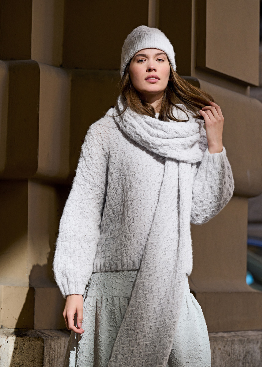 Garn: Lana Grossa «Nebbia» (55 % ren ull (merino extrafine), 45 % alpakka (baby), LL = ca. 170 m/50 g): 50 g hvitgrå (frg 8). Pinner: Kort rundp nr. 5 og 5,5, strømpep nr. 5,5.