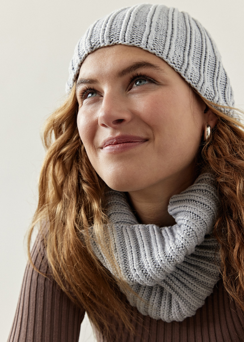 Lana Grossa Puro Vegano (65% bomull, 20% lyocell (tencel), 15% polyamid, löplängd 90 m/50 g), 100 g isblå (färg 10); strumpstickor nr. 4.