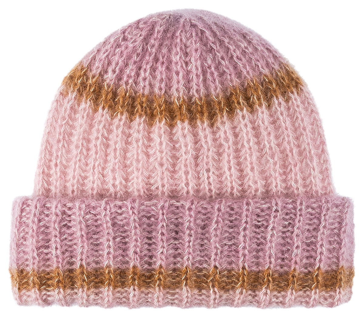Lana Grossa Silkhair (70% mohair, 30% siden, löplängd 210 m/25 g), 25 g rosa (färg 85), 25 g guldbrun (färg 115), 25 g grålila (färg 152) och 25 g mjuk lila (färg 87); strumpstickor nr. 5.