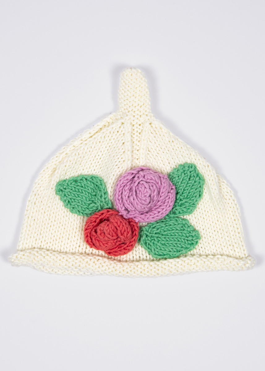 Lana Grossa-kvalitet ”Soft Cotton” (70 % bomuld, 30 % polyakryl, løbelængde = ca. 140 m / 50 gr.): 50(50- 100-100) gr ecru (fv 2), 50 gr syren (fv 22), 50 gr azalea (fv 20) og 50 gr lysegrøn (fv 23), strikkepinde nr. 4½.
