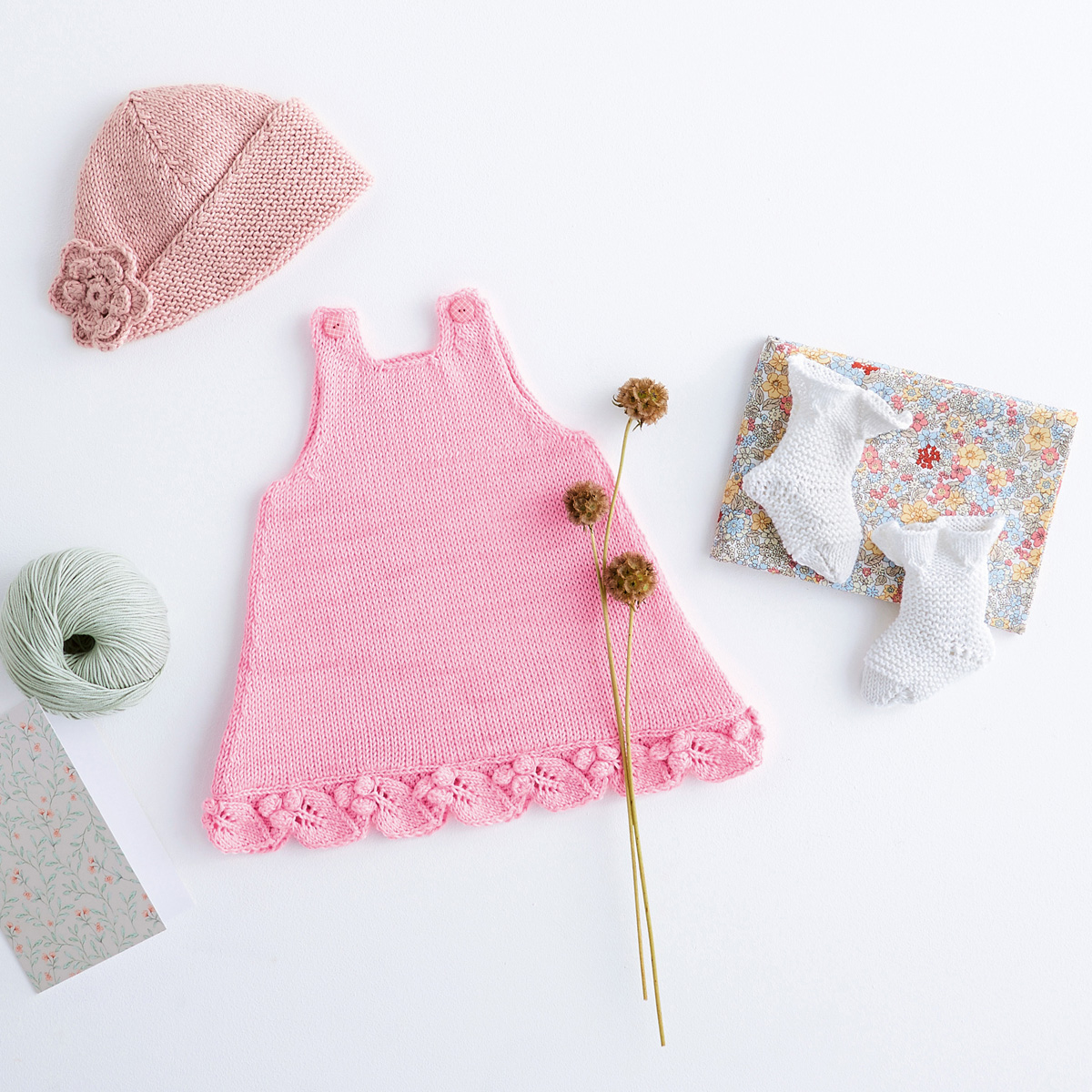 Lana Grossa-kvalitet ”Soft Cotton” (70 % bomuld, 30 % mikrofiber, løbelængde = ca. 140 m / 50 gr.): 50(50-50-100) gr rosa (fv 6), strømpepinde nr. 4, rundpind nr. 3½, 40 cm, hæklenål nr. 3.